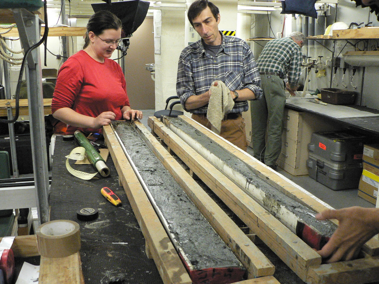 A piston core of sediment taken from the sea floor of the Arctic Ocean. Leonid Polyak pictured at right.