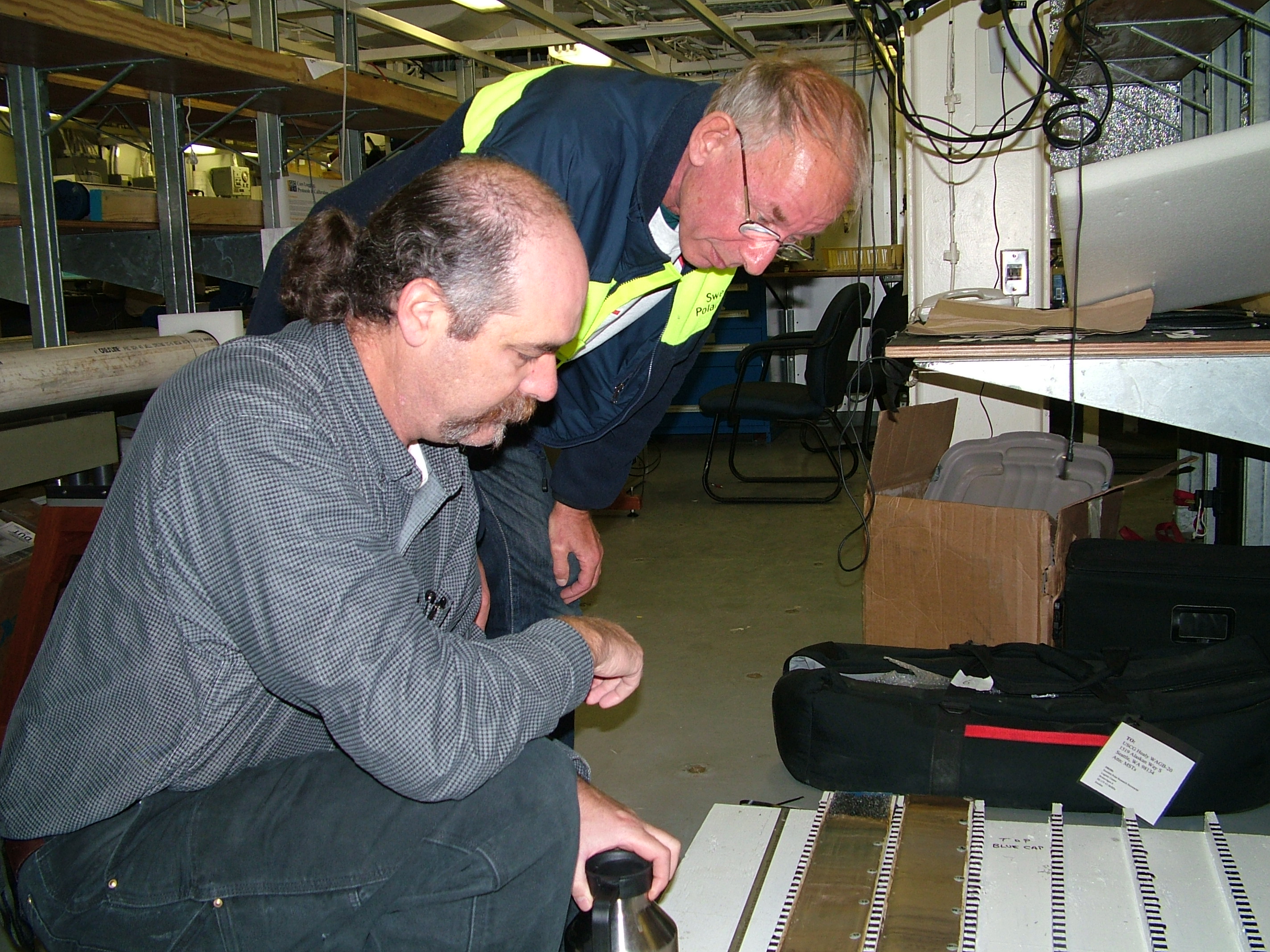 Reidar Lovlie explains core sediments to David Hassiley on board the USCGC Healy.