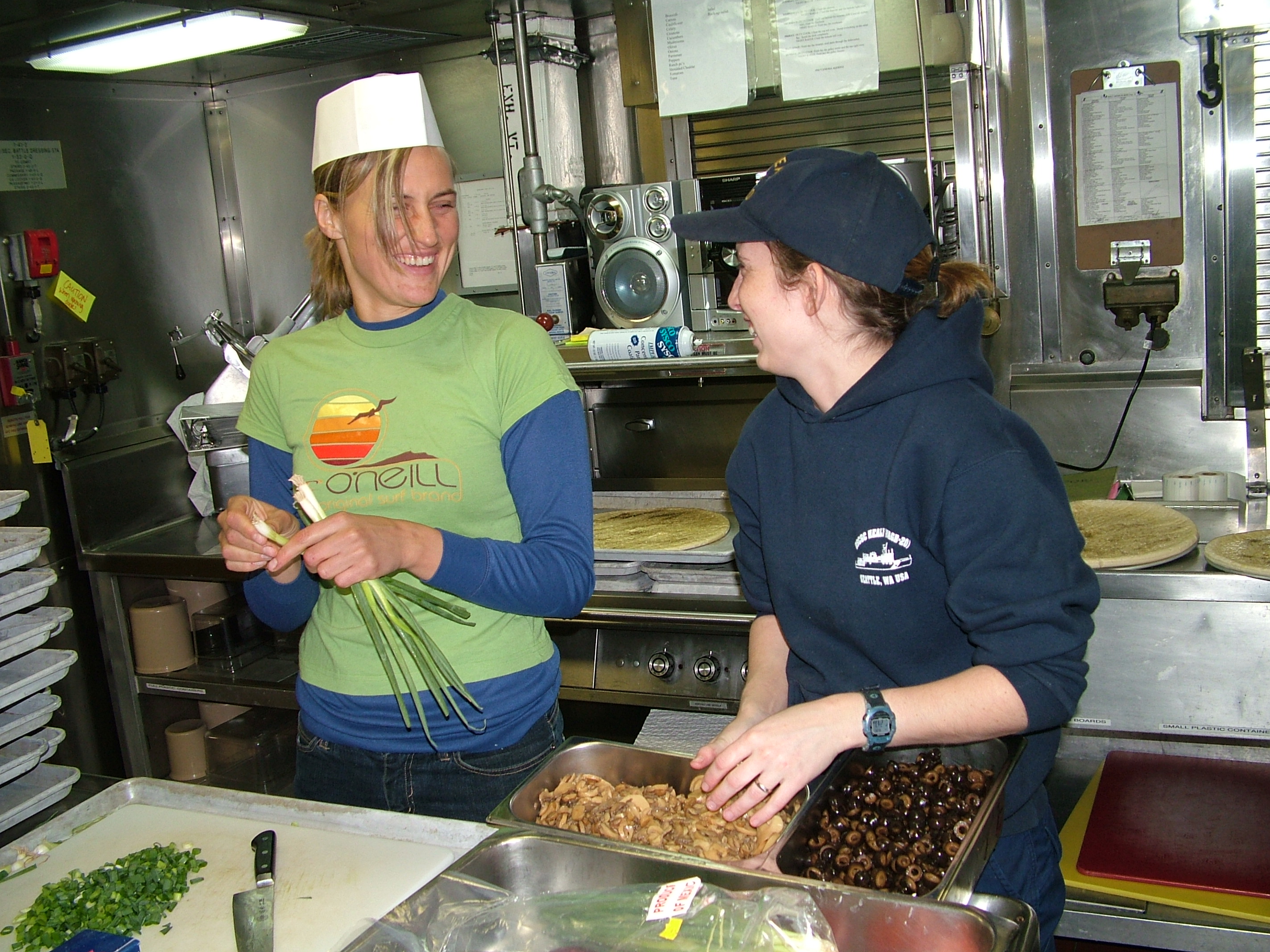 Christina (on L) the coast guard cook helps Vibeke Bruvoll find the right spices to seasons the pizzas during pizza night on the UCGCC Healy.