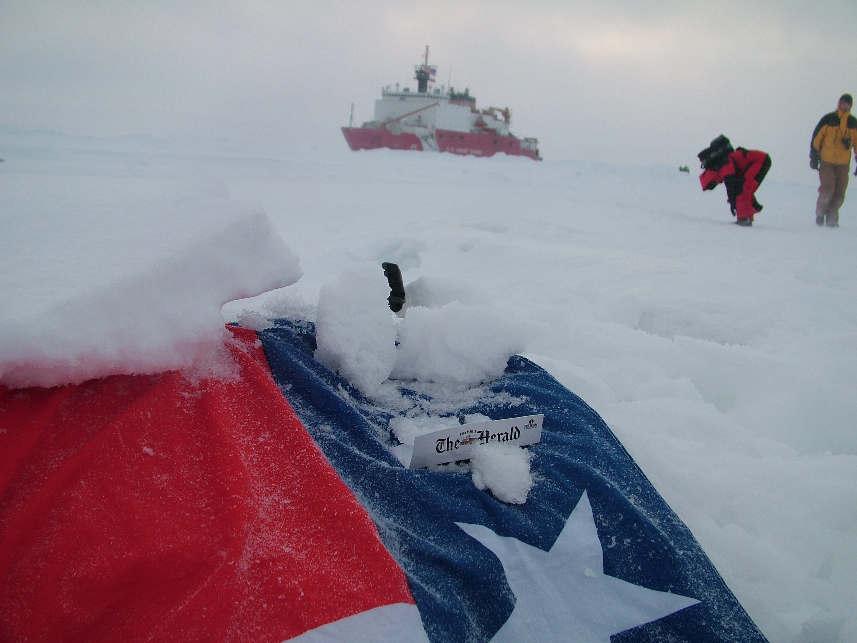 The Texas state flag rests on the ice of the Arctic Ocean, put there by TREC teacher Ute Kaden. The USCGC Healy can be seen in the background.