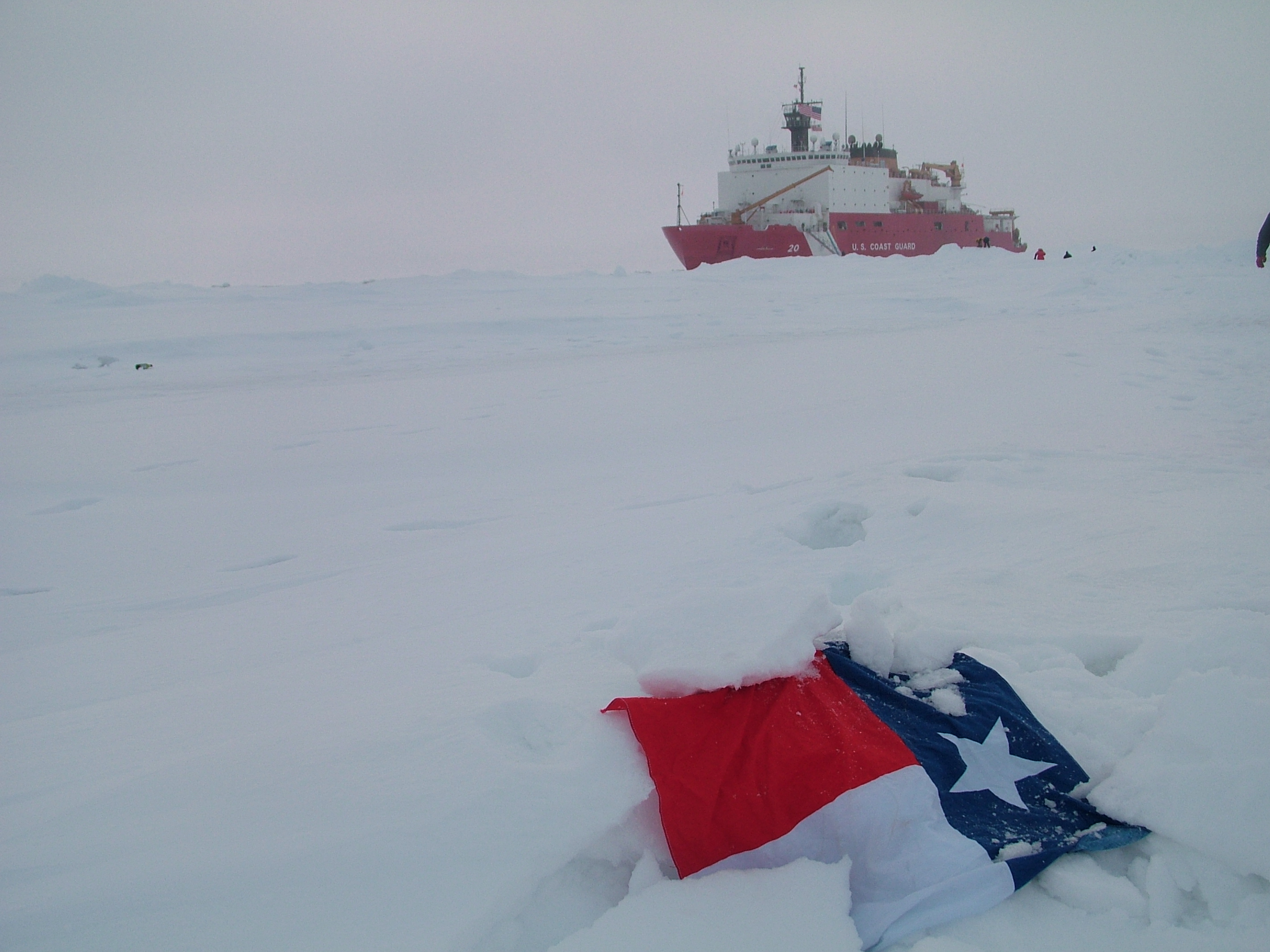 A view of the US Coast Guard (USCG) Icebreaker Healy with the Texas flad in the foreground.
