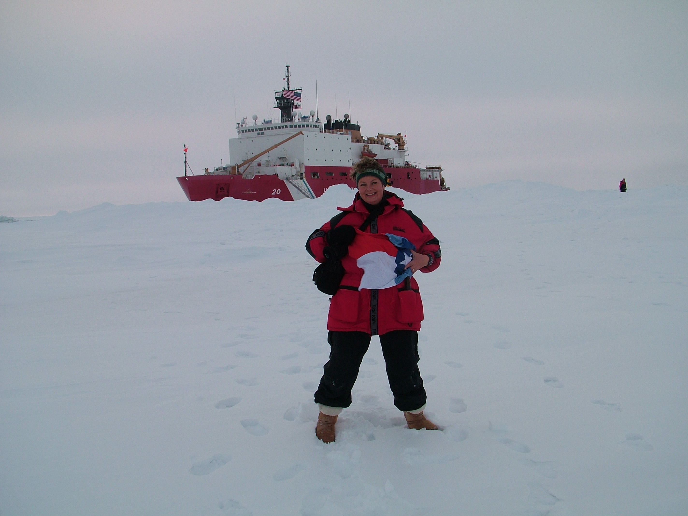 A view of the US Coast Guard (USCG) Icebreaker Healy and TREC teacher Ute Kaden.