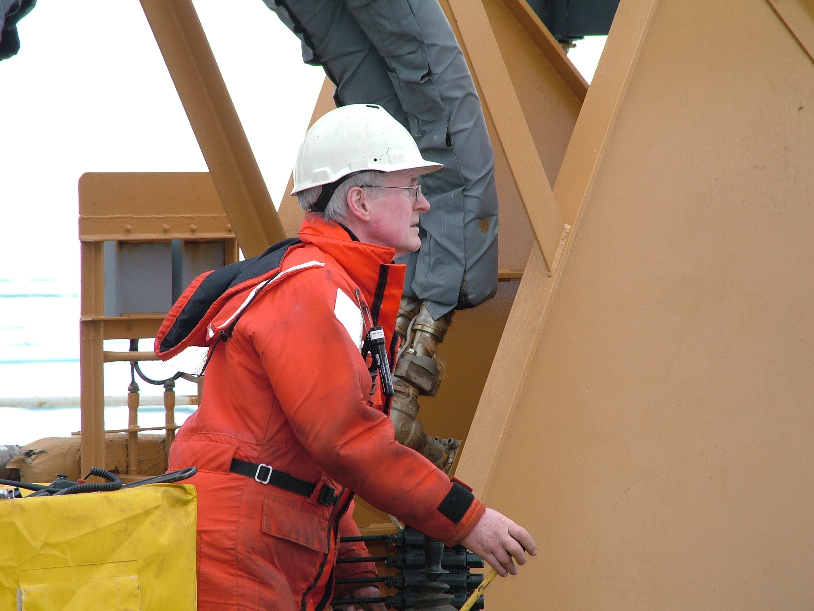 Yngve Kristofferson of the University of Bergen directing the crane for the air guns on board the USCGC Healy.