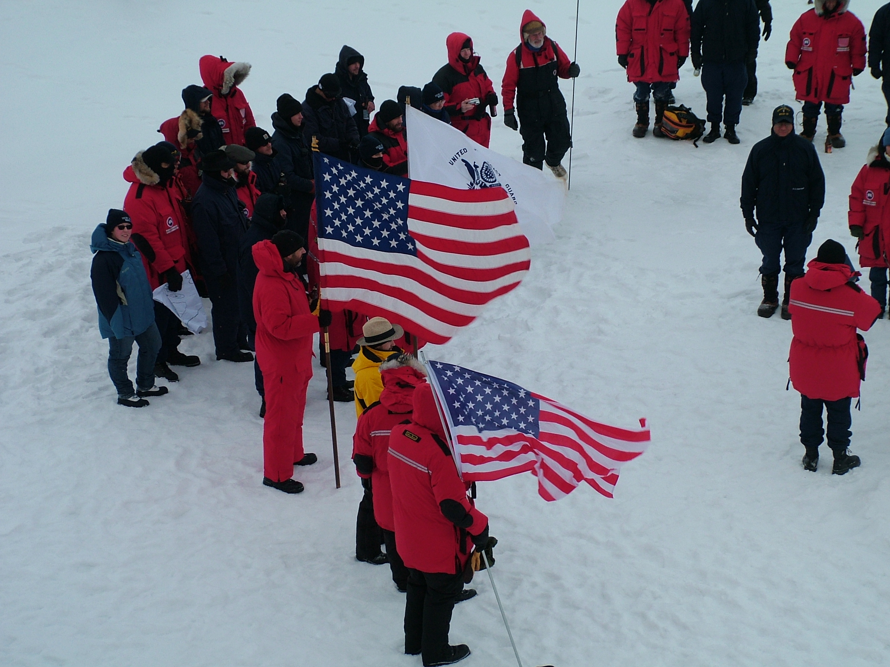 The crew of the USCGC Healy enjoy an ice liberty at the North Pole.