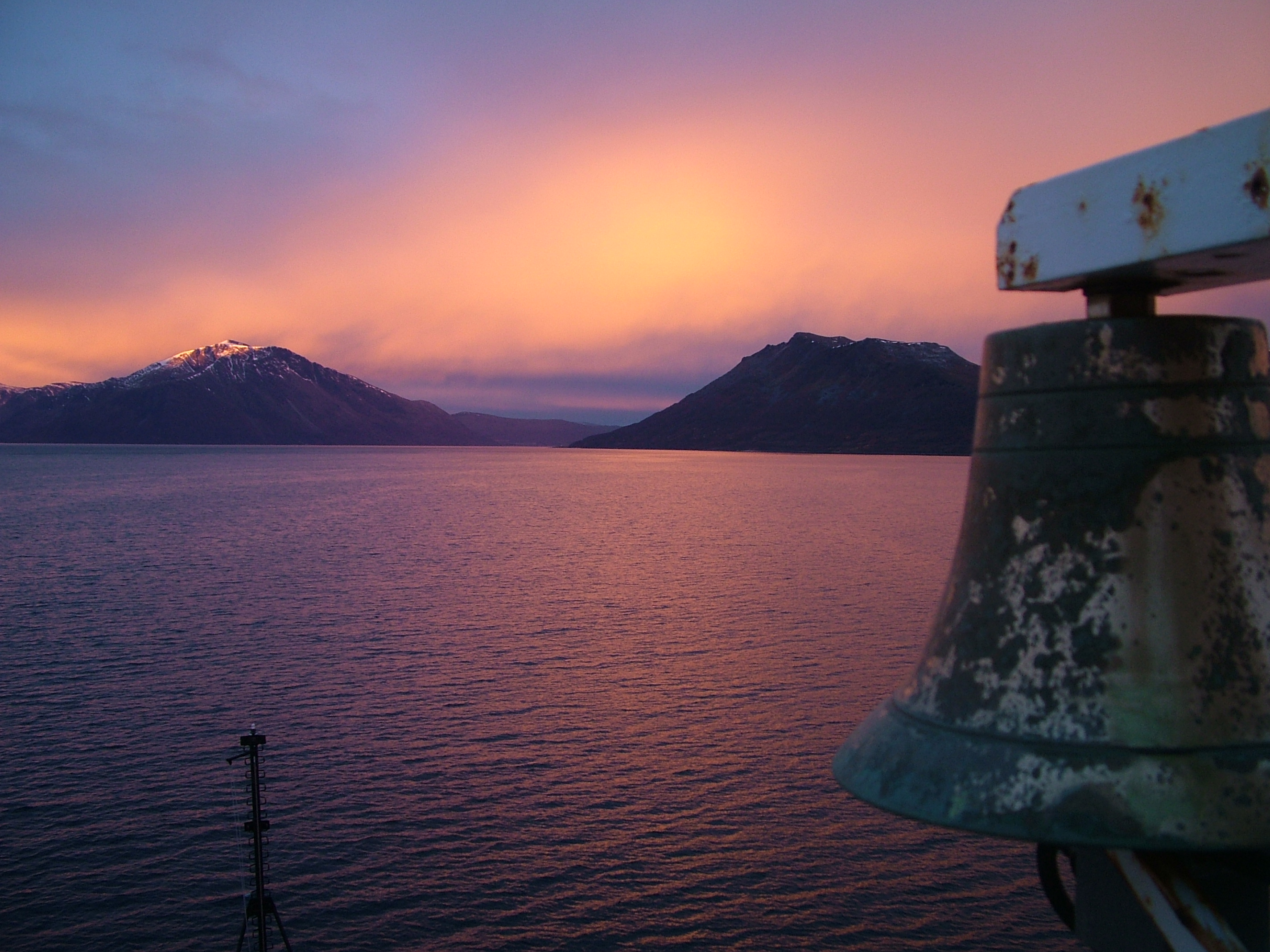 A sunset and the coast of Norway, seen by TREC teacher from on board the USCGC Healy, with the ship's bell in the forground.