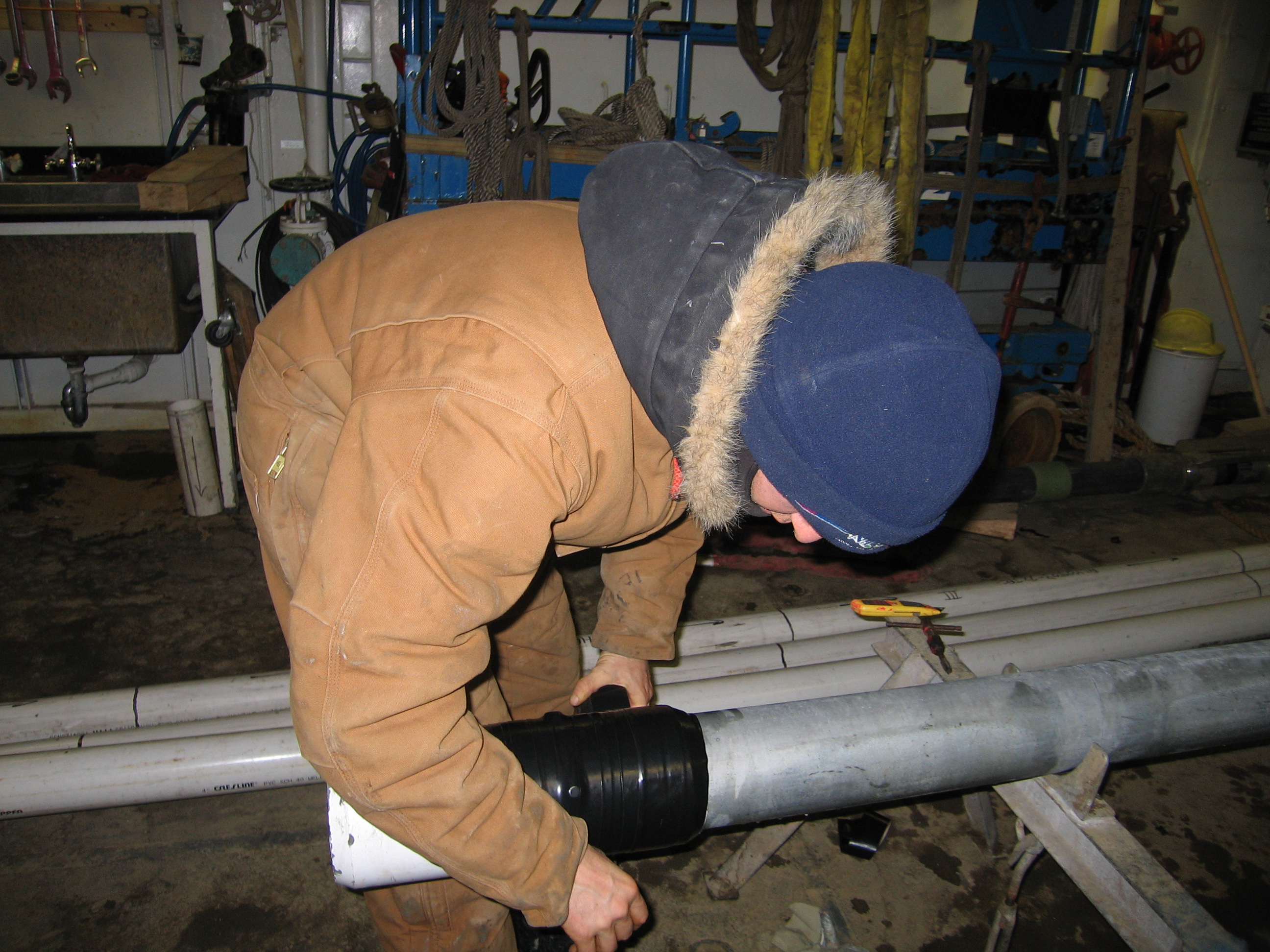 Preparing coring equipment to take a sea floor core with the Jumbo Piston Core (JPC) on board the USCGC Healy.