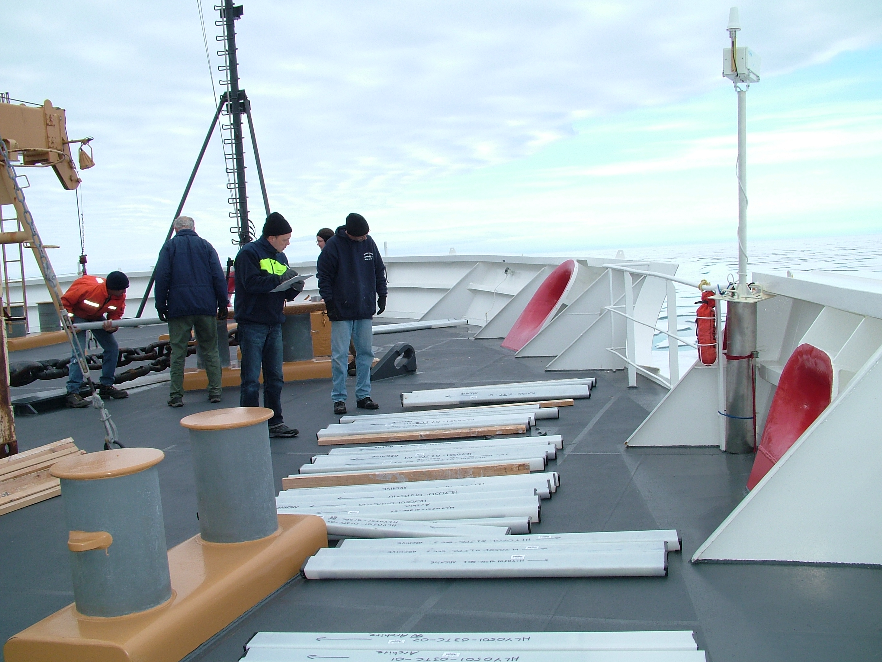 Sediment cores being prepared for storage on board the USCGC Healy.