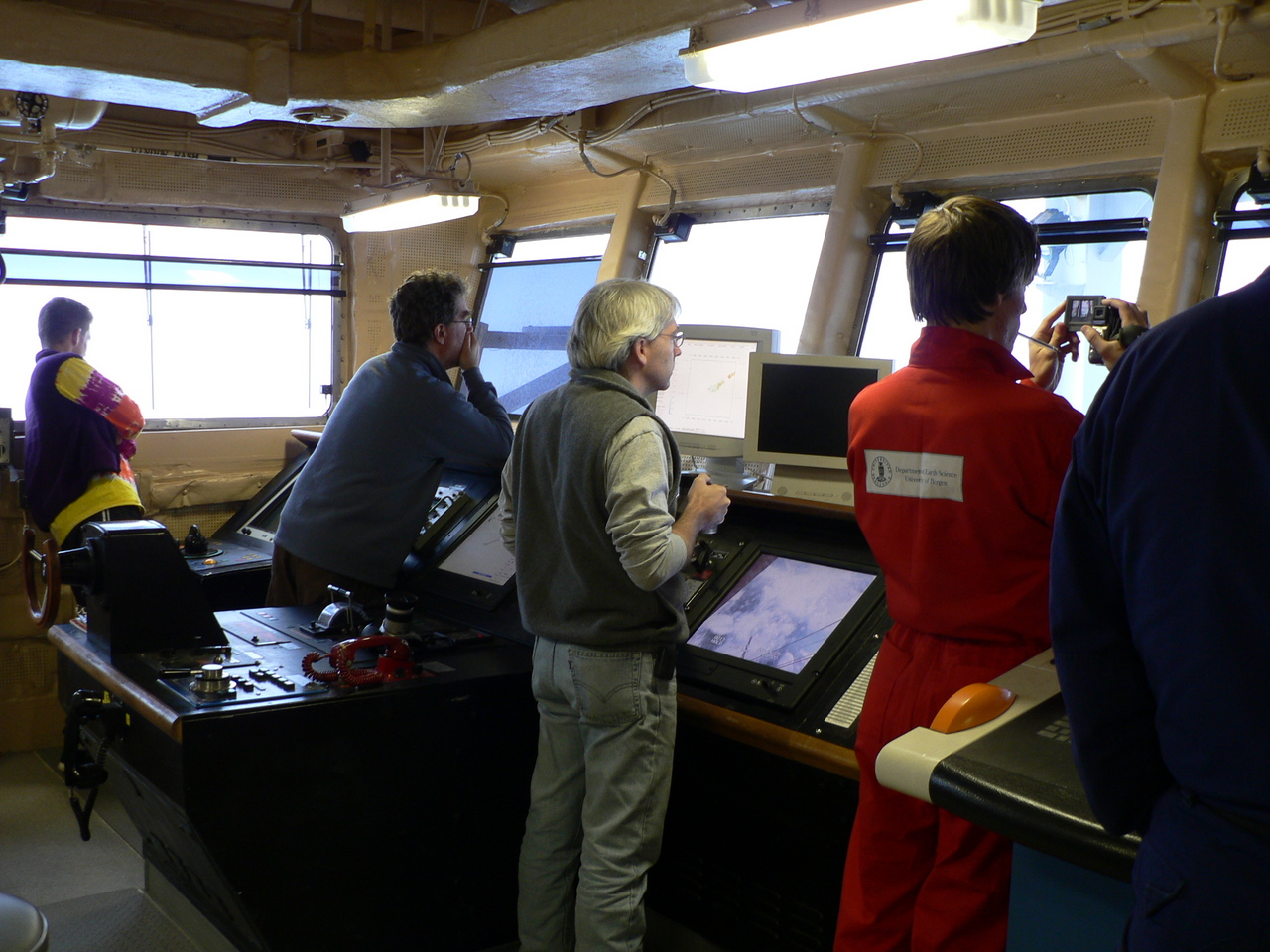Several researchers look out the windows of the bridge of the USCGC Healy.