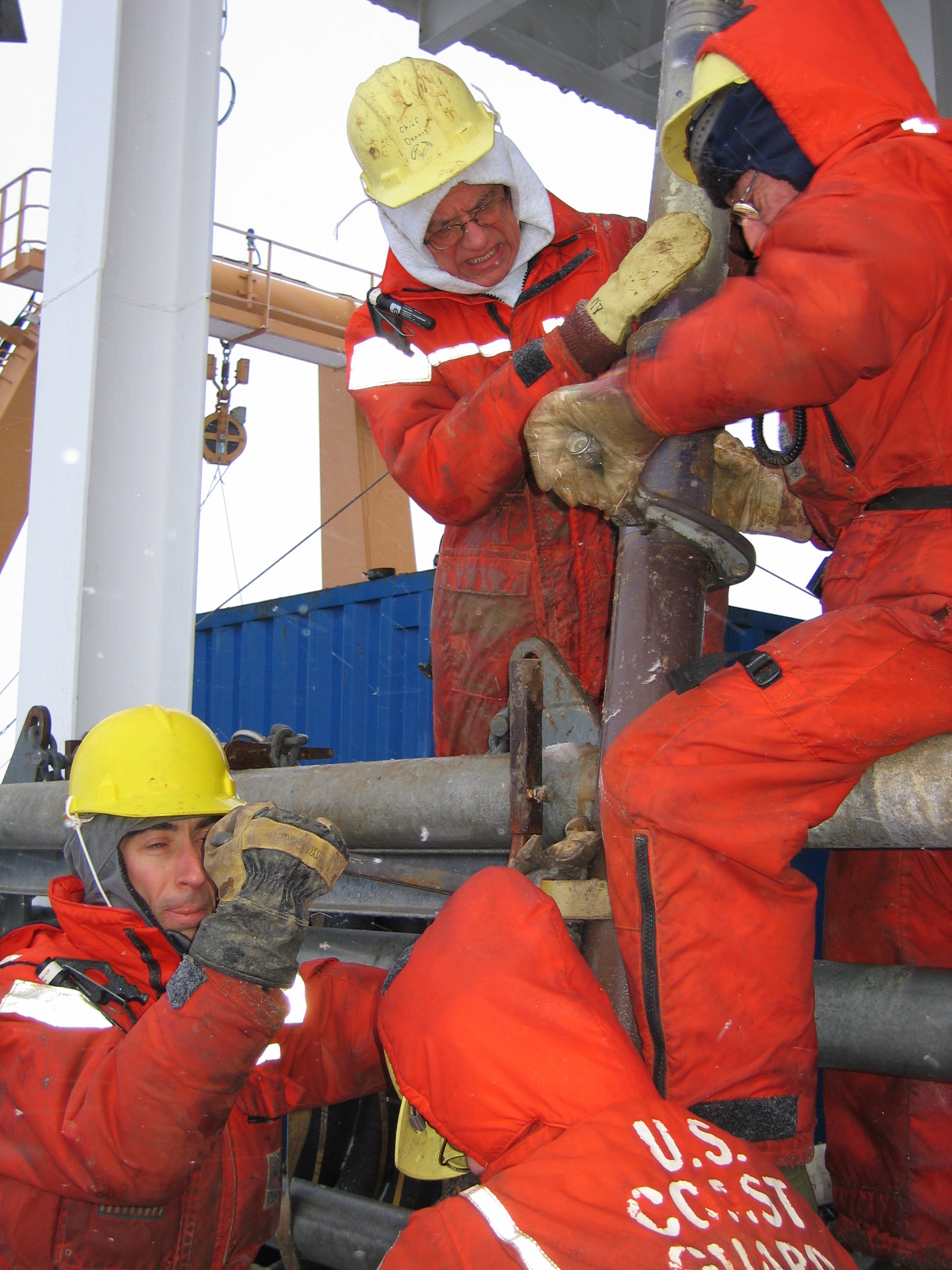Dr. Dennis Darby of Old Dominion University and crew members of the USCGC Healy help retrieve a piston core of the Arctic Ocean floor.