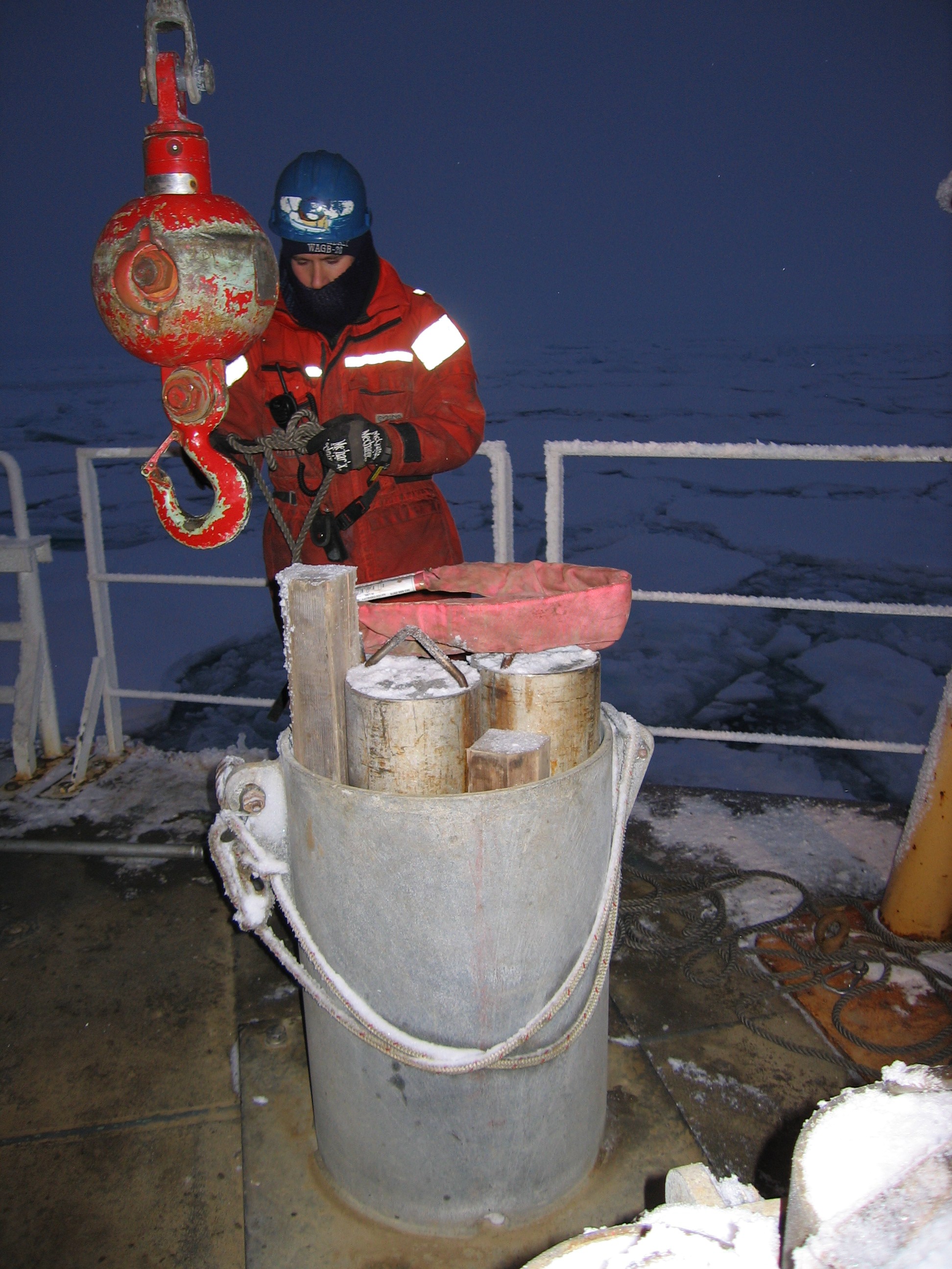 Preparing to take a sea floor core with the Jumbo Piston Core (JPC) on board the USCGC Healy.