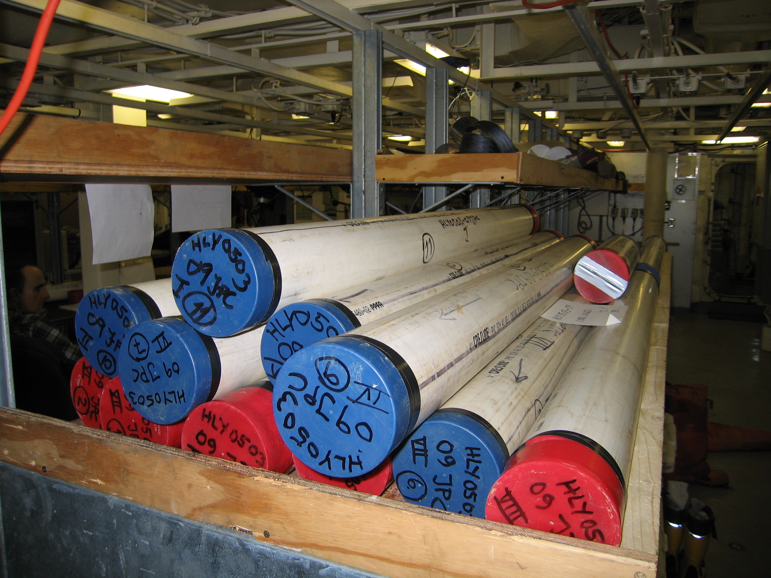 A view of several of the jumbo piston corer (JPC) sediment cores from the floor of the Arctic Ocean.