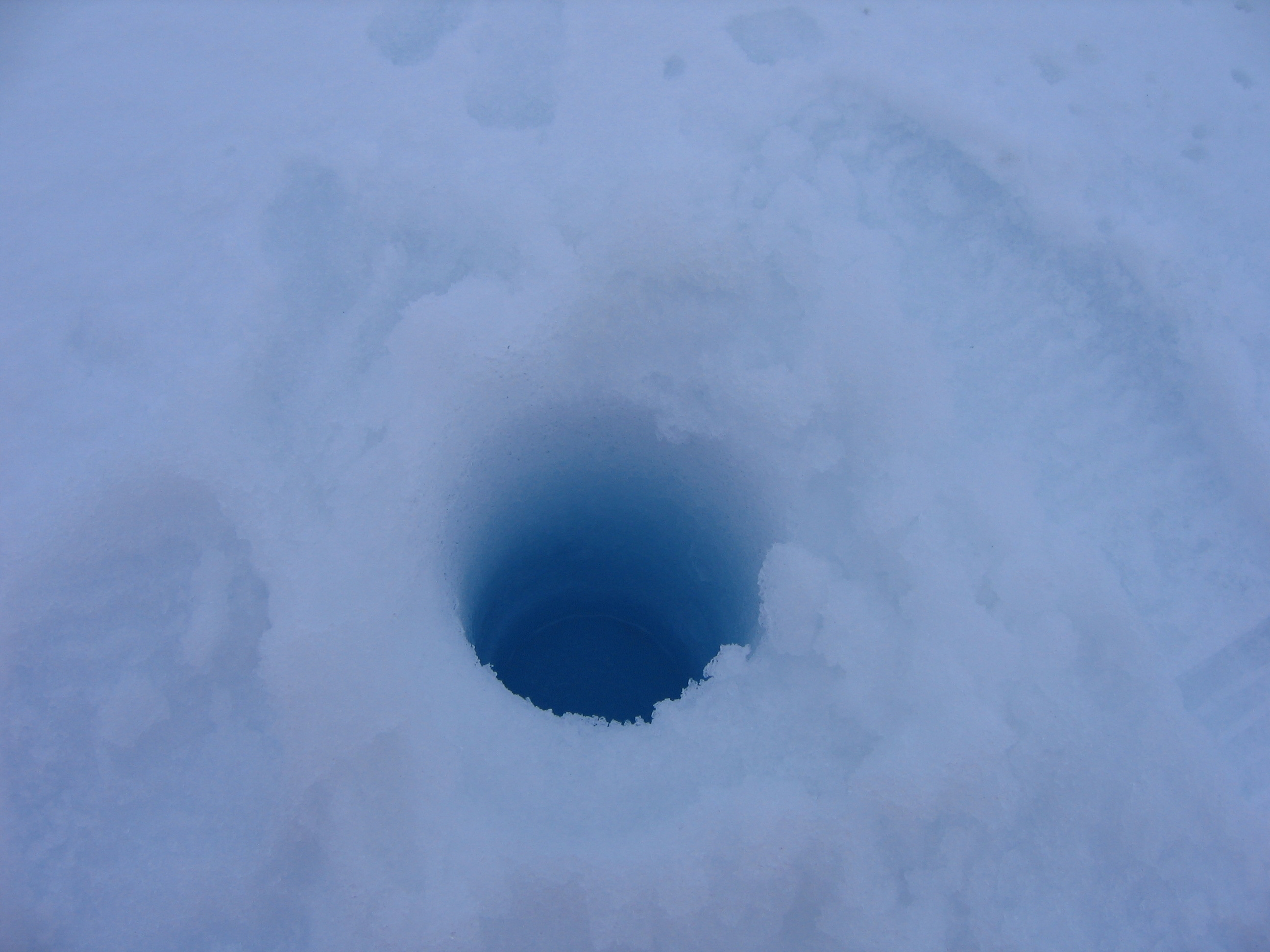 A hole left in the sea ice of the Arctic Ocean where a ice core was removed.