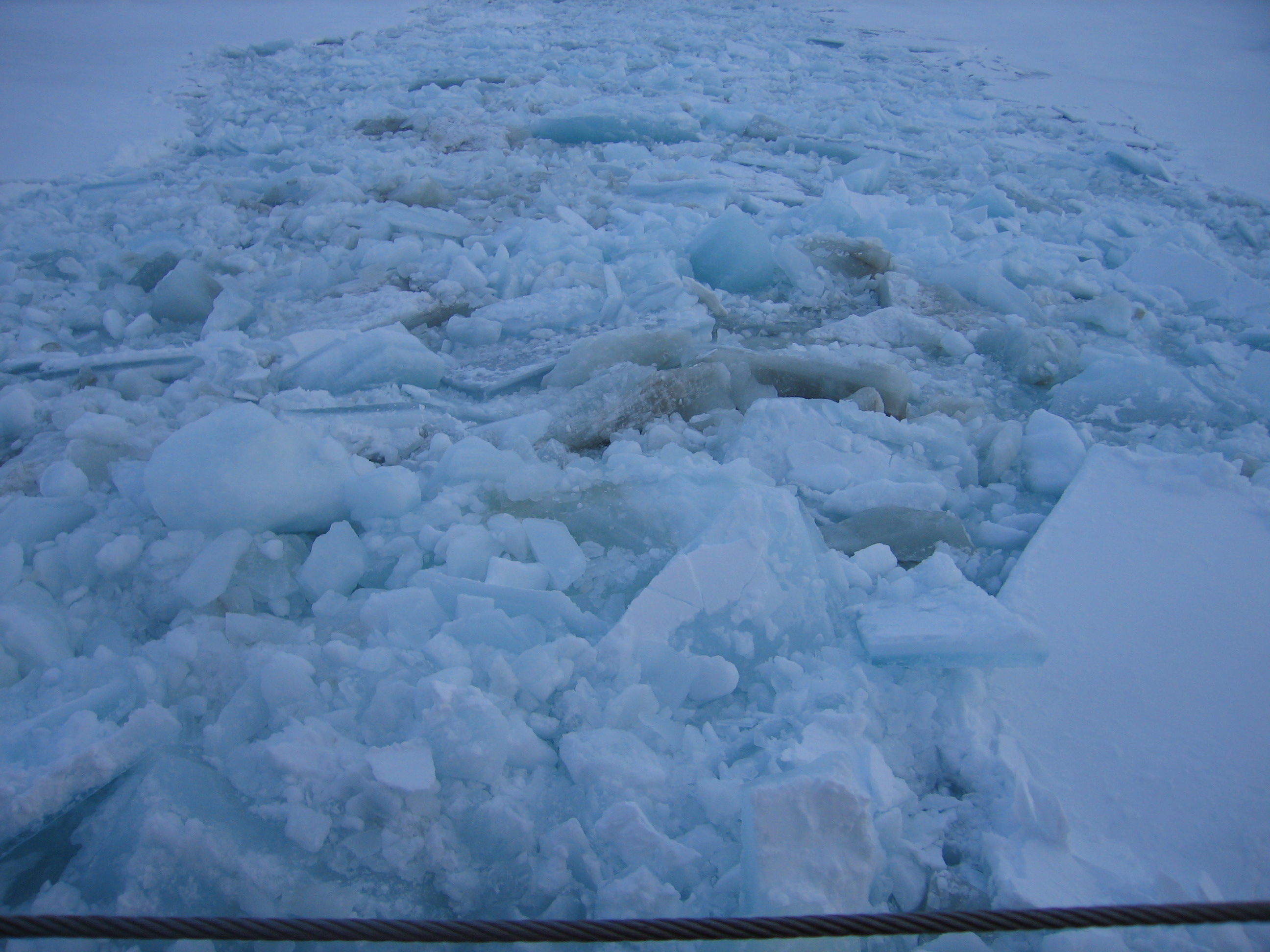 The trail of broken ice left behind the USCGC Healy. It is quickly refreezing.
