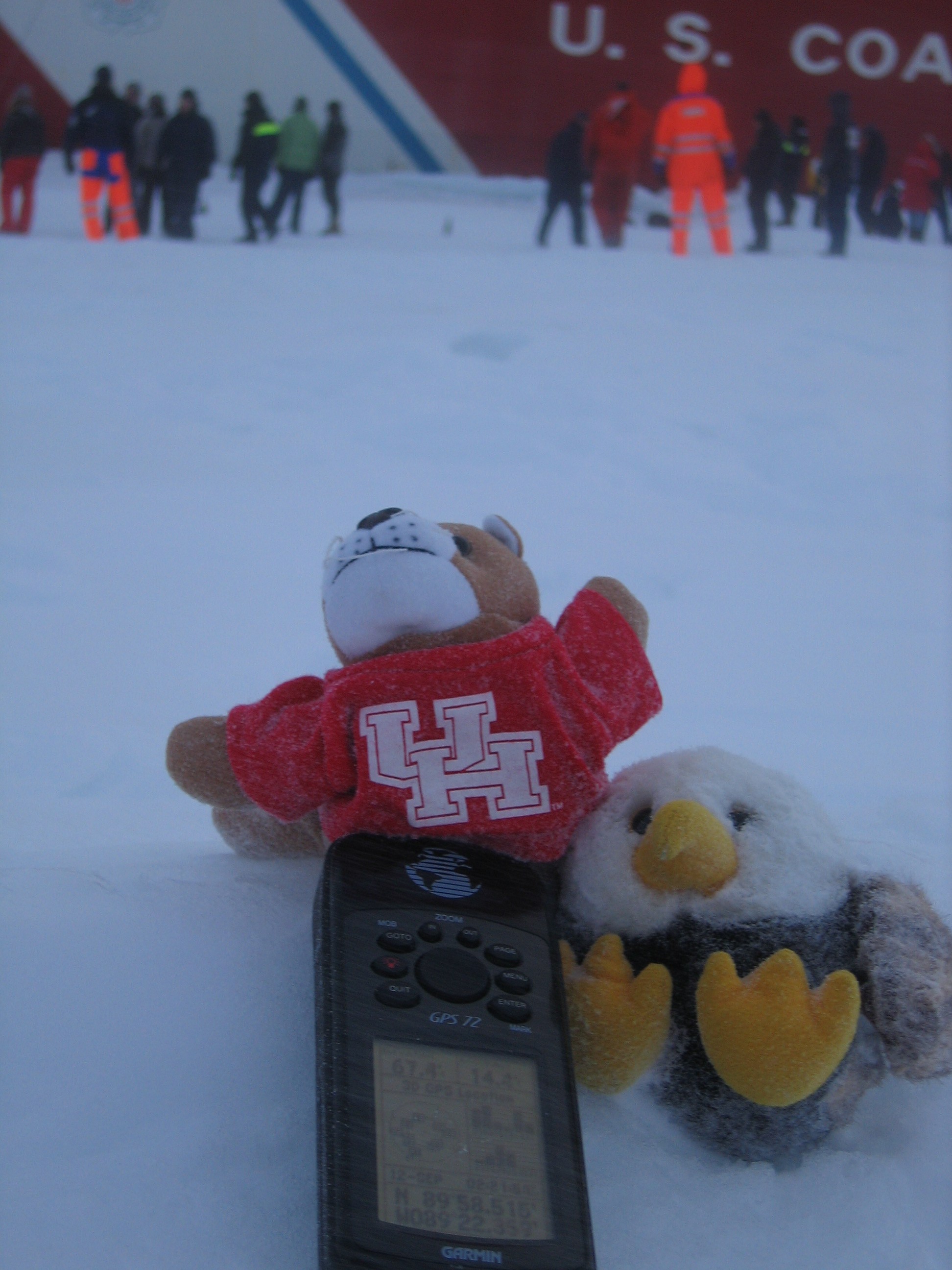 The Hanna High School Eagle and the University of Houston Cougar on the ice during the USCGC Healy's ice liberty at the North Pole.