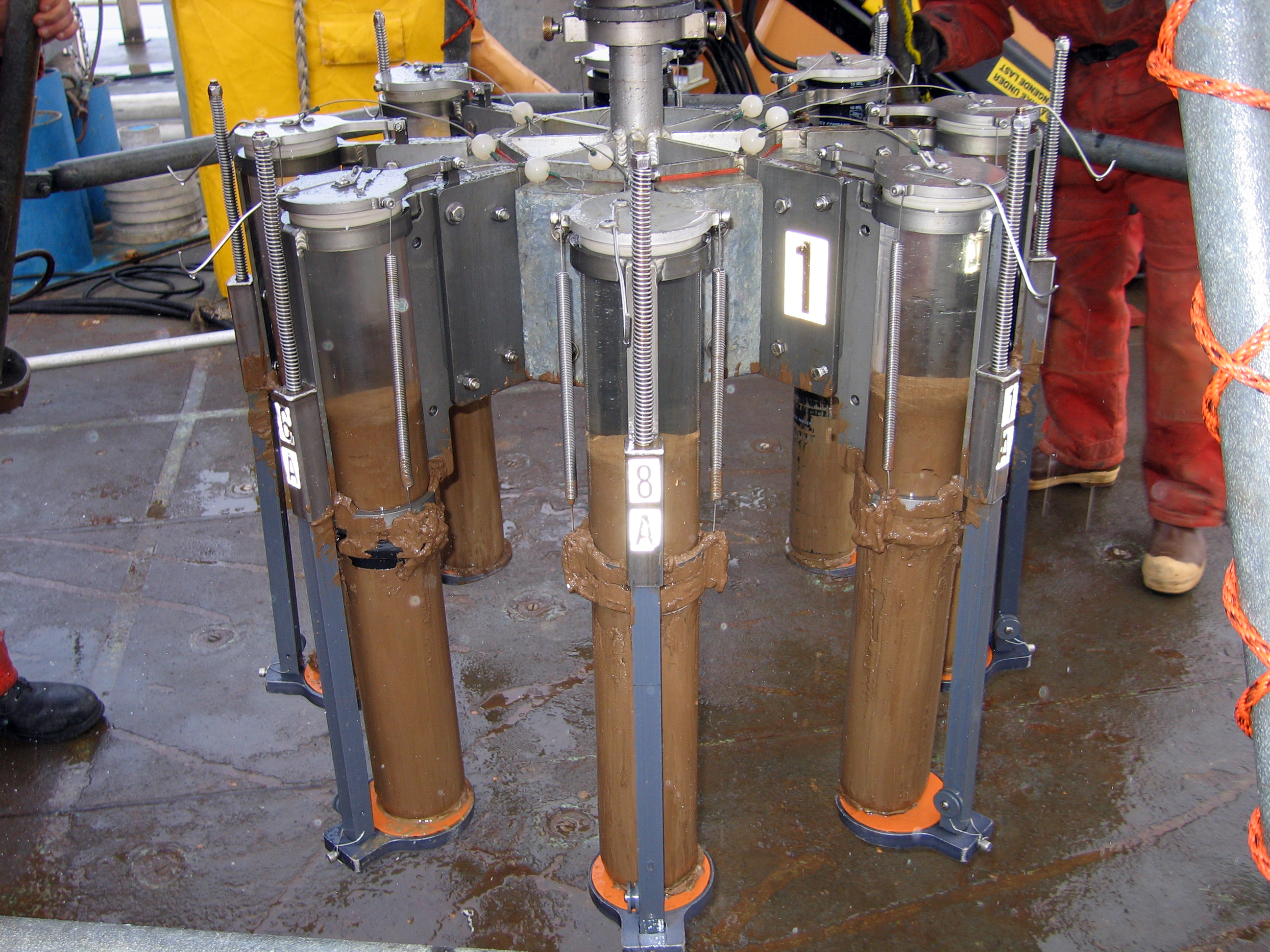 A multicore and sediment retrieved from the top layer of the ocean floor.