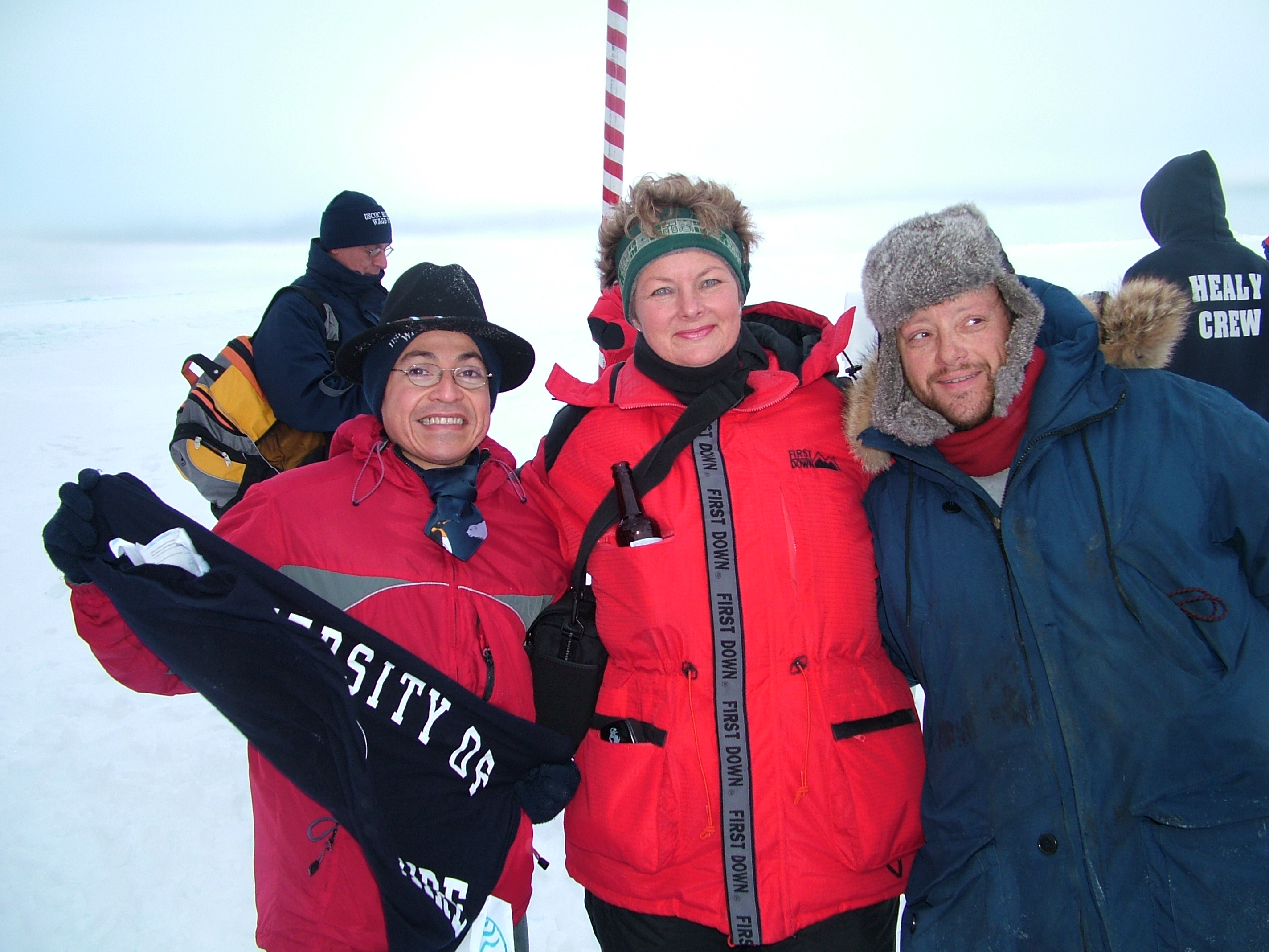 The crew of the USCGC Healy enjoy an ice liberty at the North Pole.