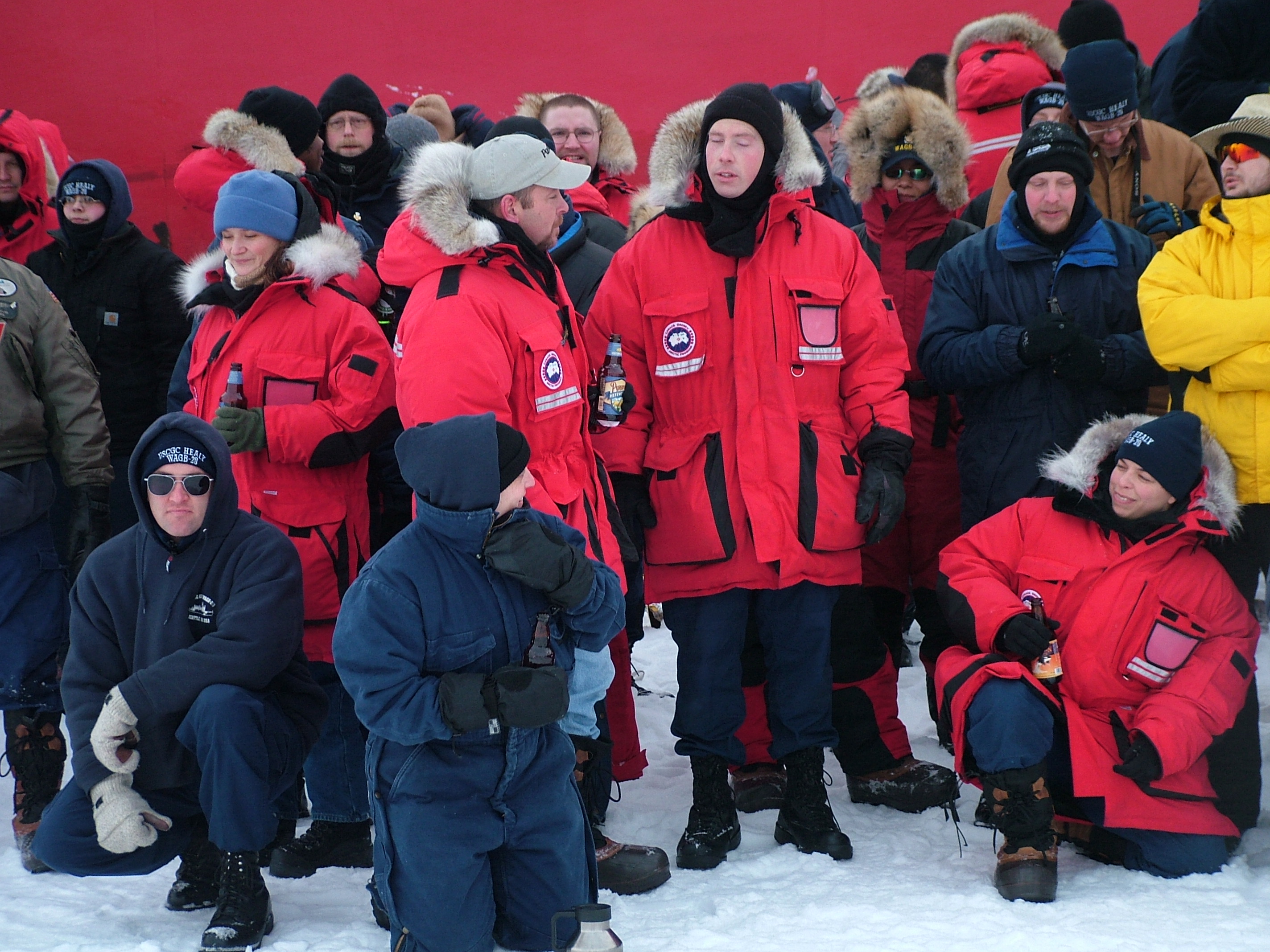 The crew of the USCGC Healy enjoy an ice liberty at the North Pole.