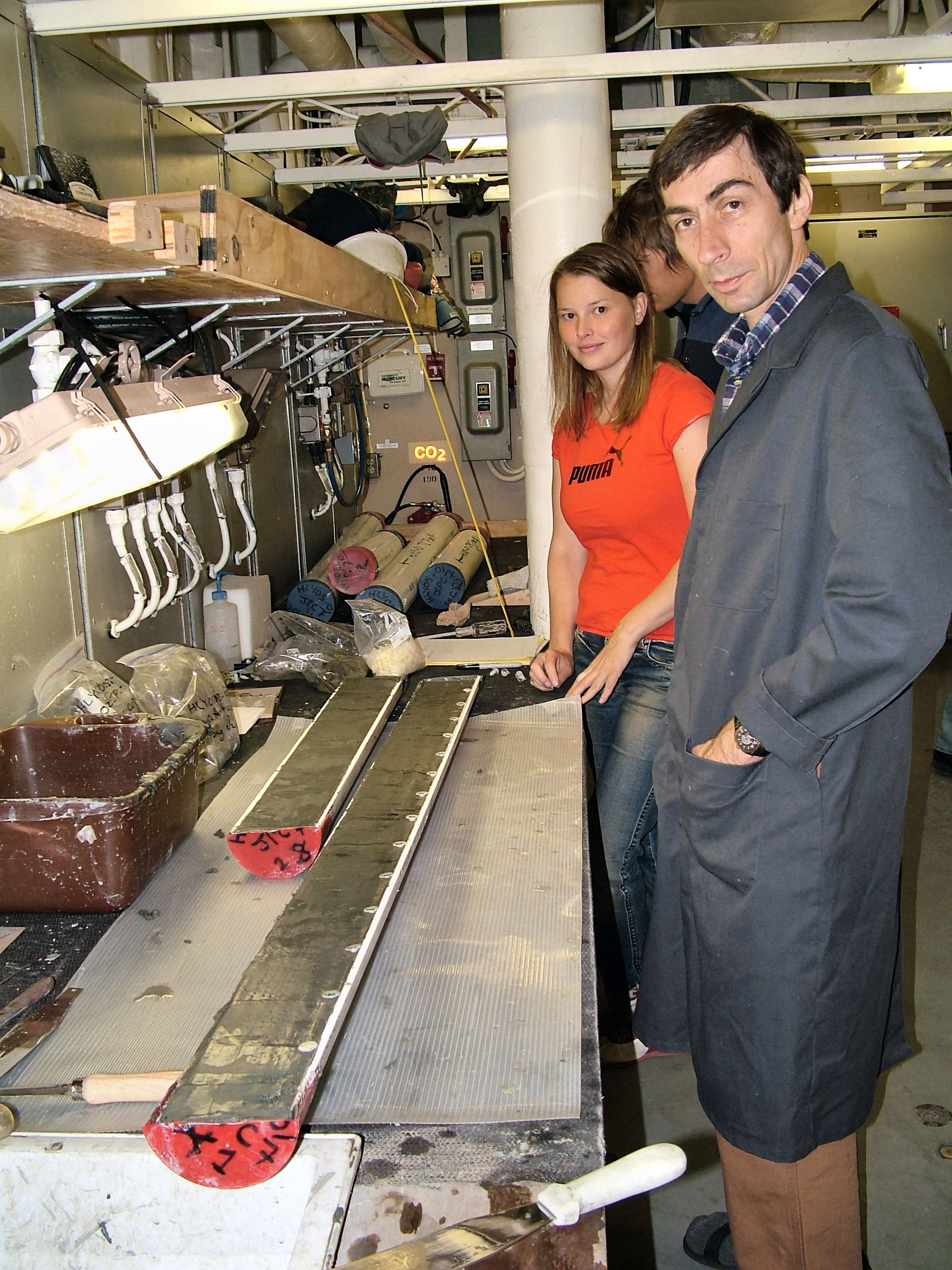 Researcher Leonid Polyak and Emma Sellen looking at sediment core data on board the USCGC Healy.