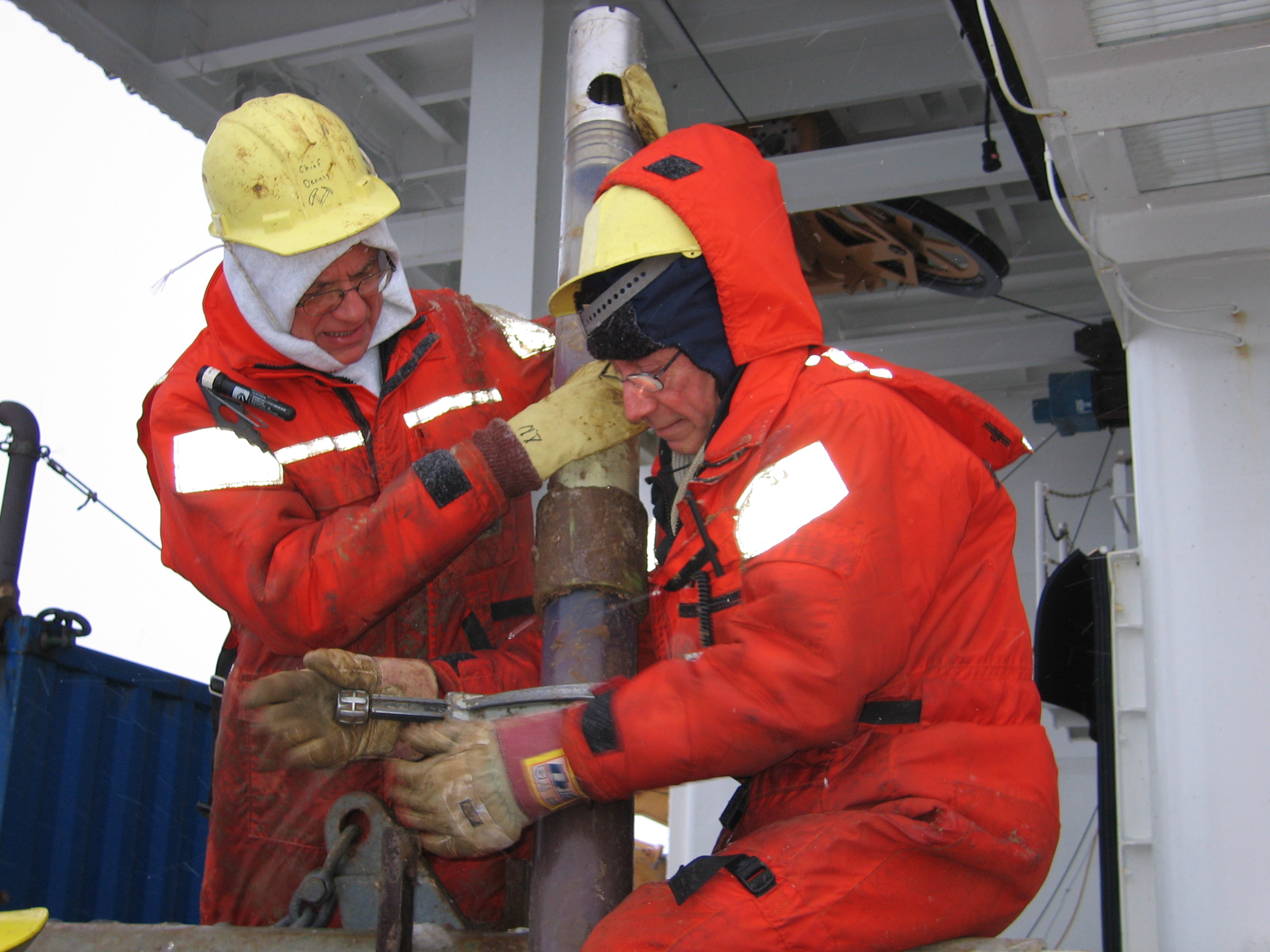 Dr. Dennis Darby of Old Dominion University and a crew member of the USCGC Healy help retrieve a piston core of the Arctic Ocean floor.