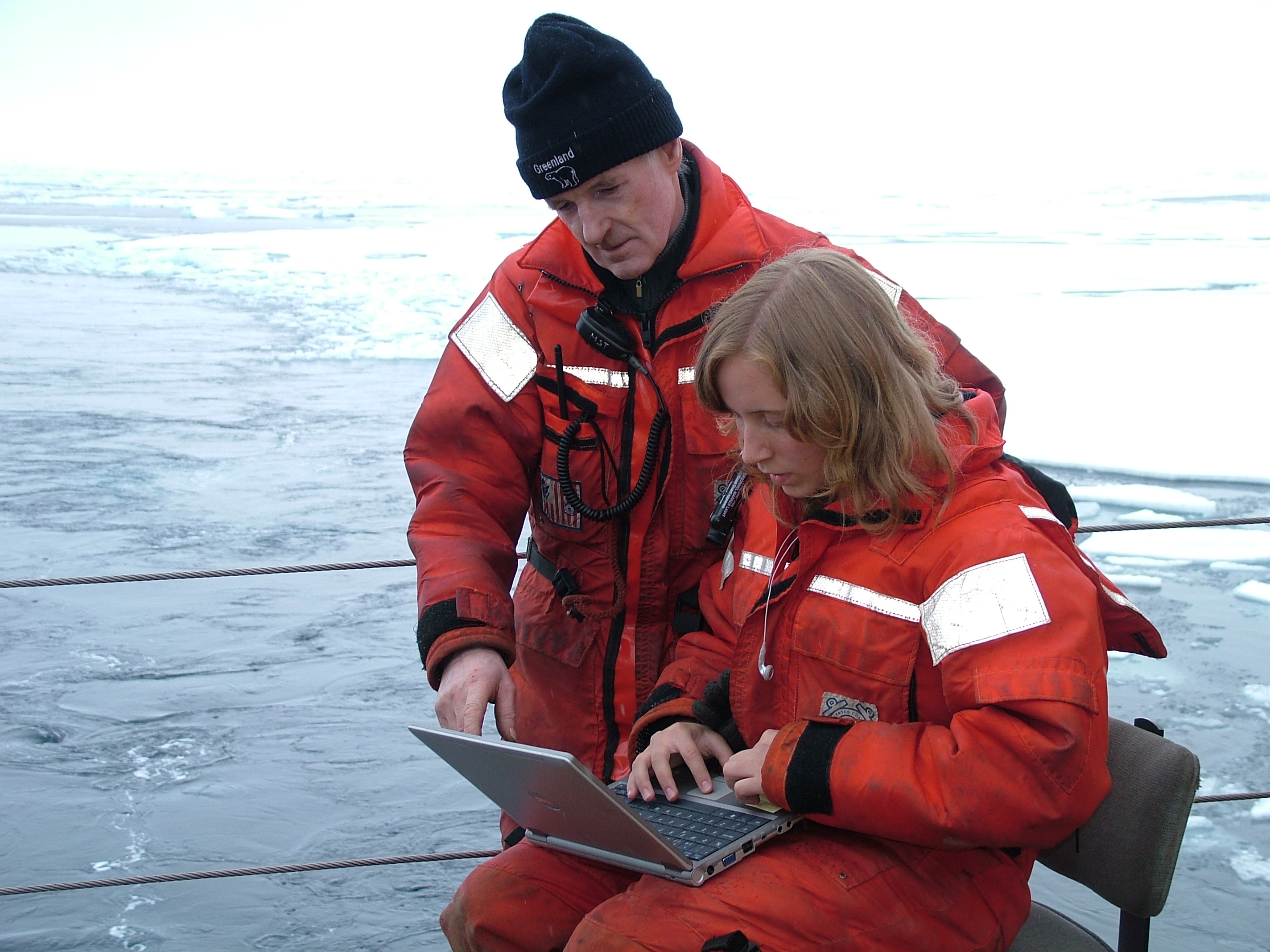 Chief seismic scientist Ingve Kristoffersen and High School student Karina Monsen, both from Noarway, observing the seismic equipment in the water from on board the USCGC Healy.