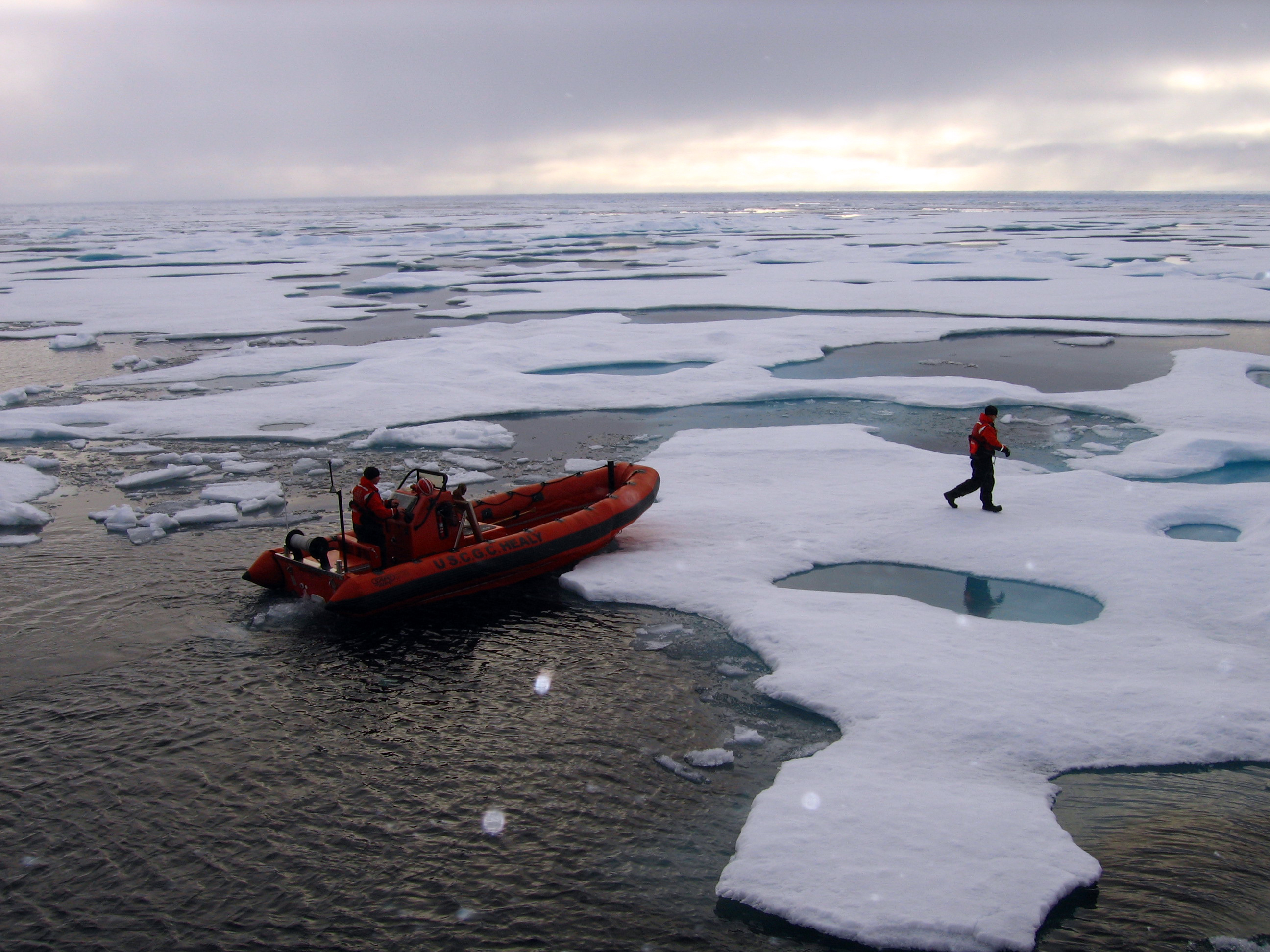 A crew member of the USCGC Healy walks on the sea ice of the Arctic Ocean.