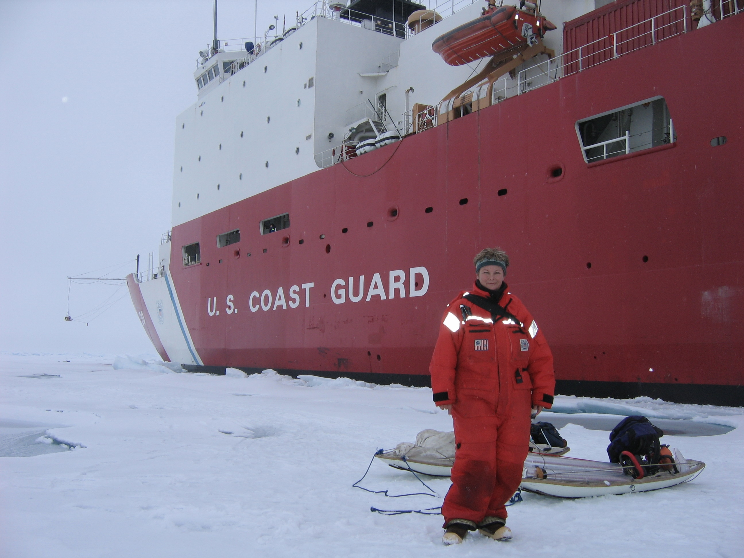 TREC teacher Ute Kaden standing on the sea ice by the USCGC Healy.