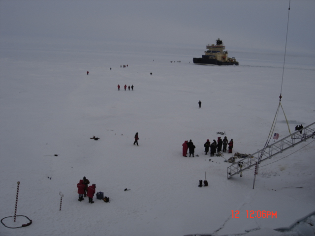 The crew of the USCGC Healy enjoy an ice liberty at the North Pole; the Swedish icebreaker Oden can be seen in the background.