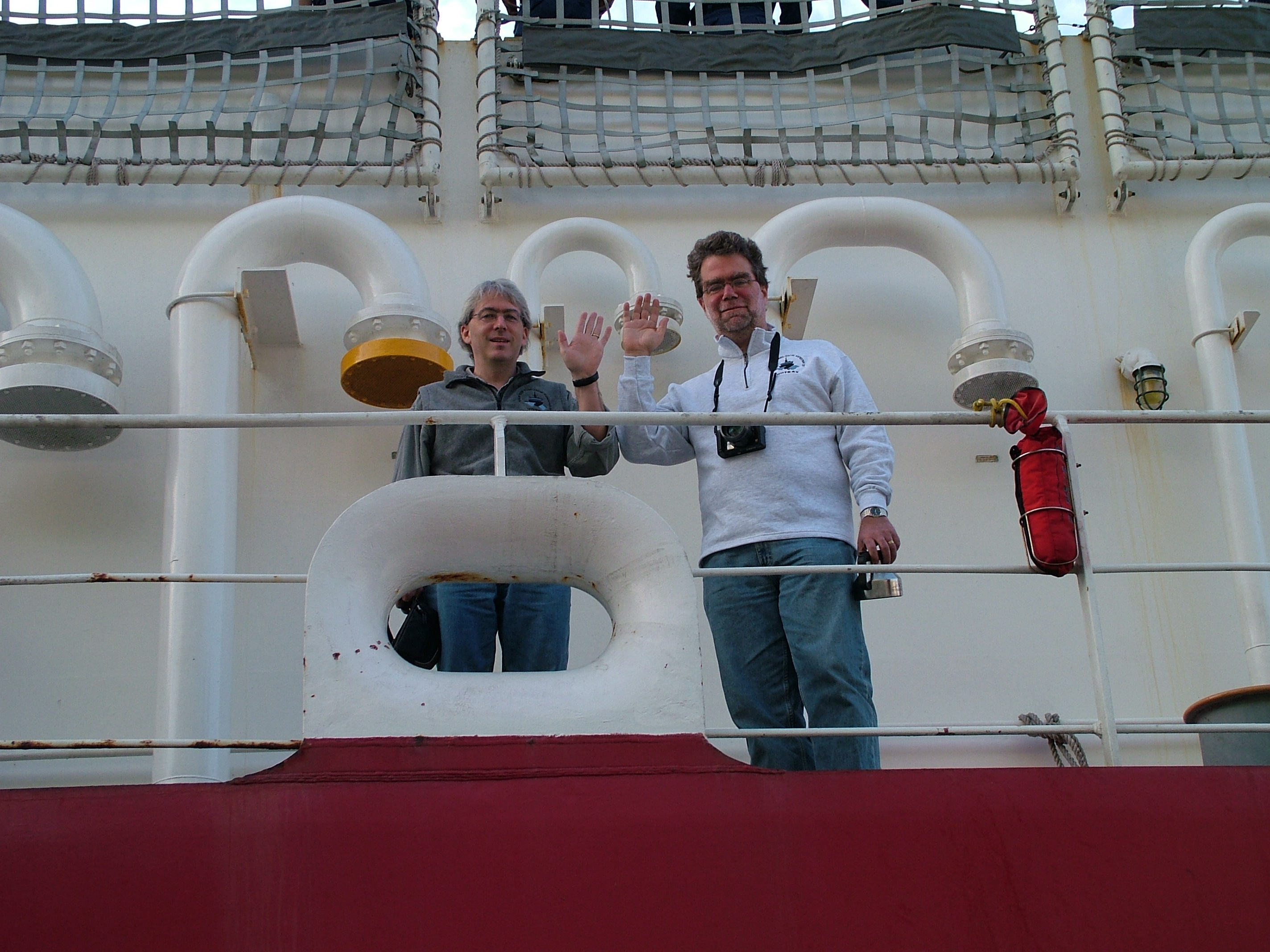 Dr. John Hopper and Dr. Bernard Coakley wave goodbye from the deck of the USCGC Healy.