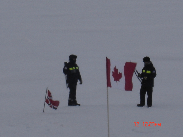 Two flags planted in the ice at the North Pole during the USCGC Healy's ice liberty.