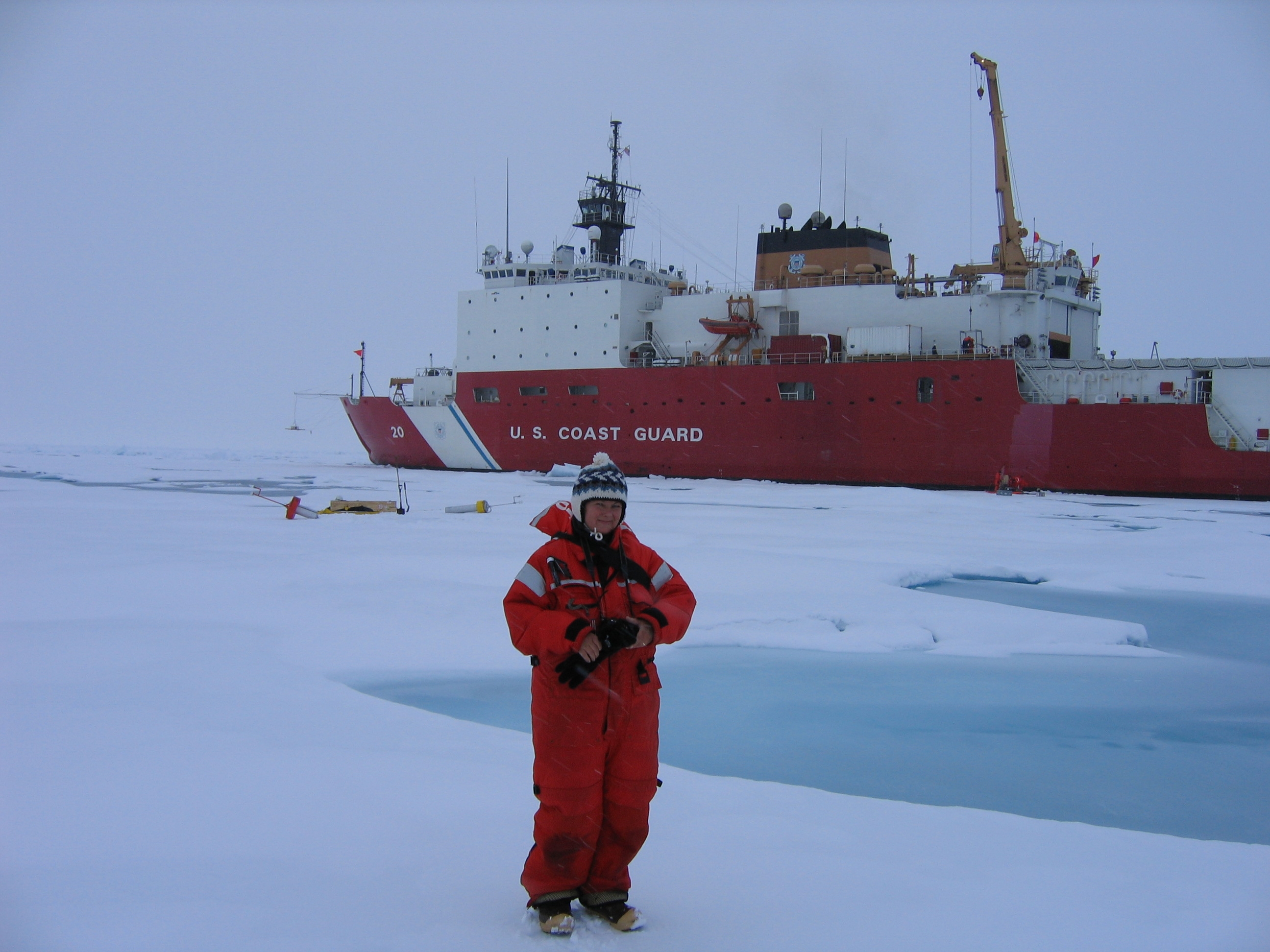 TREC teacher Ute Kaden on the sea ice of the Arctic Ocean, with the USCGC Healy in the background.