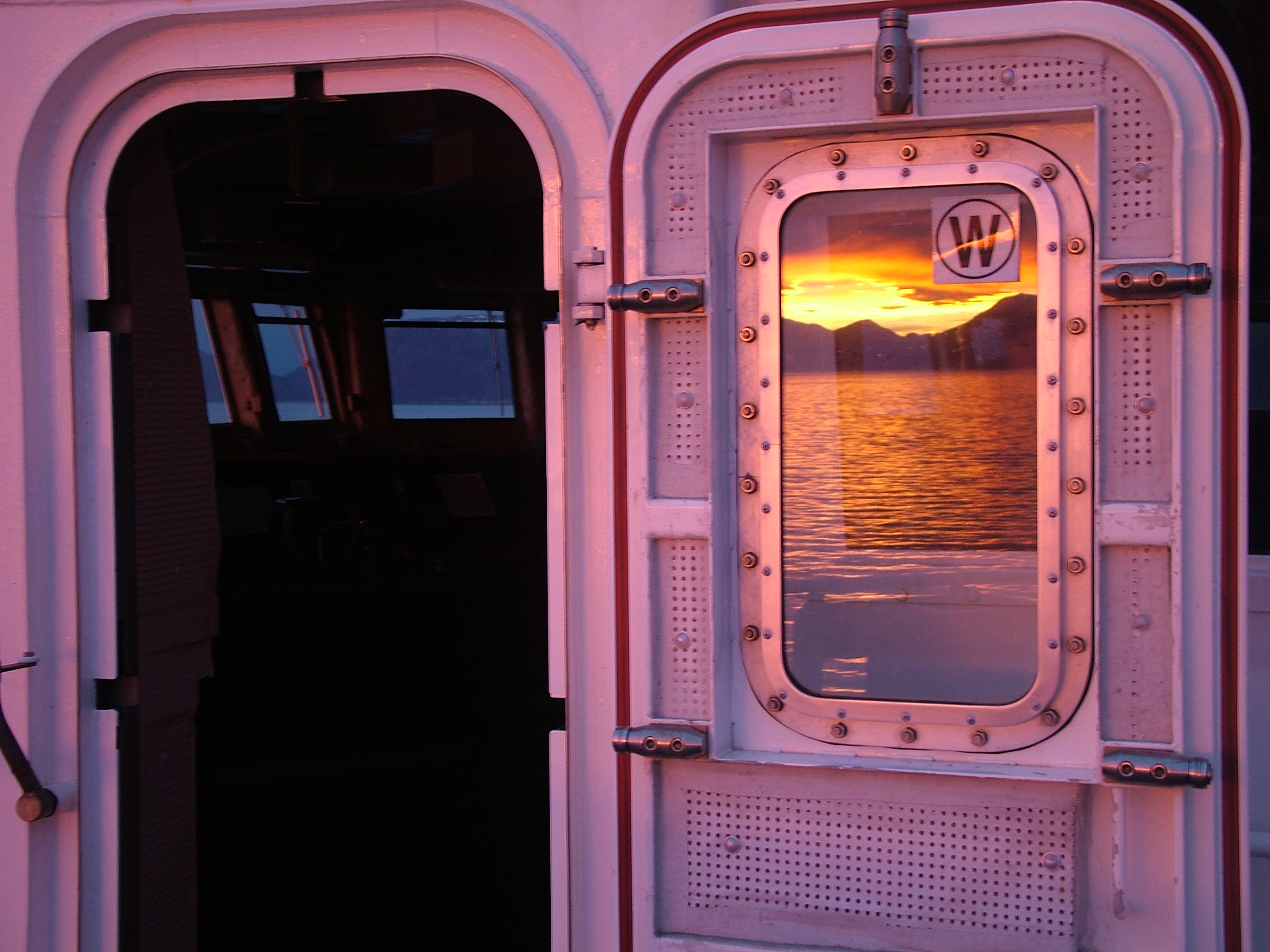 A sunset reflected in a door, seen by TREC teacher from on board the USCGC Healy.
