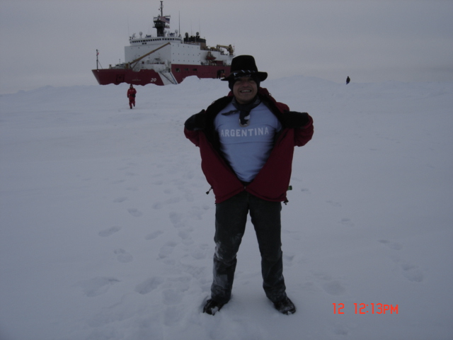 Walter Reynosa Peralta, a Lieutenant of the Argentinean Navy pictured having fun during the USCGC Healy's ice liberty at the North Pole.