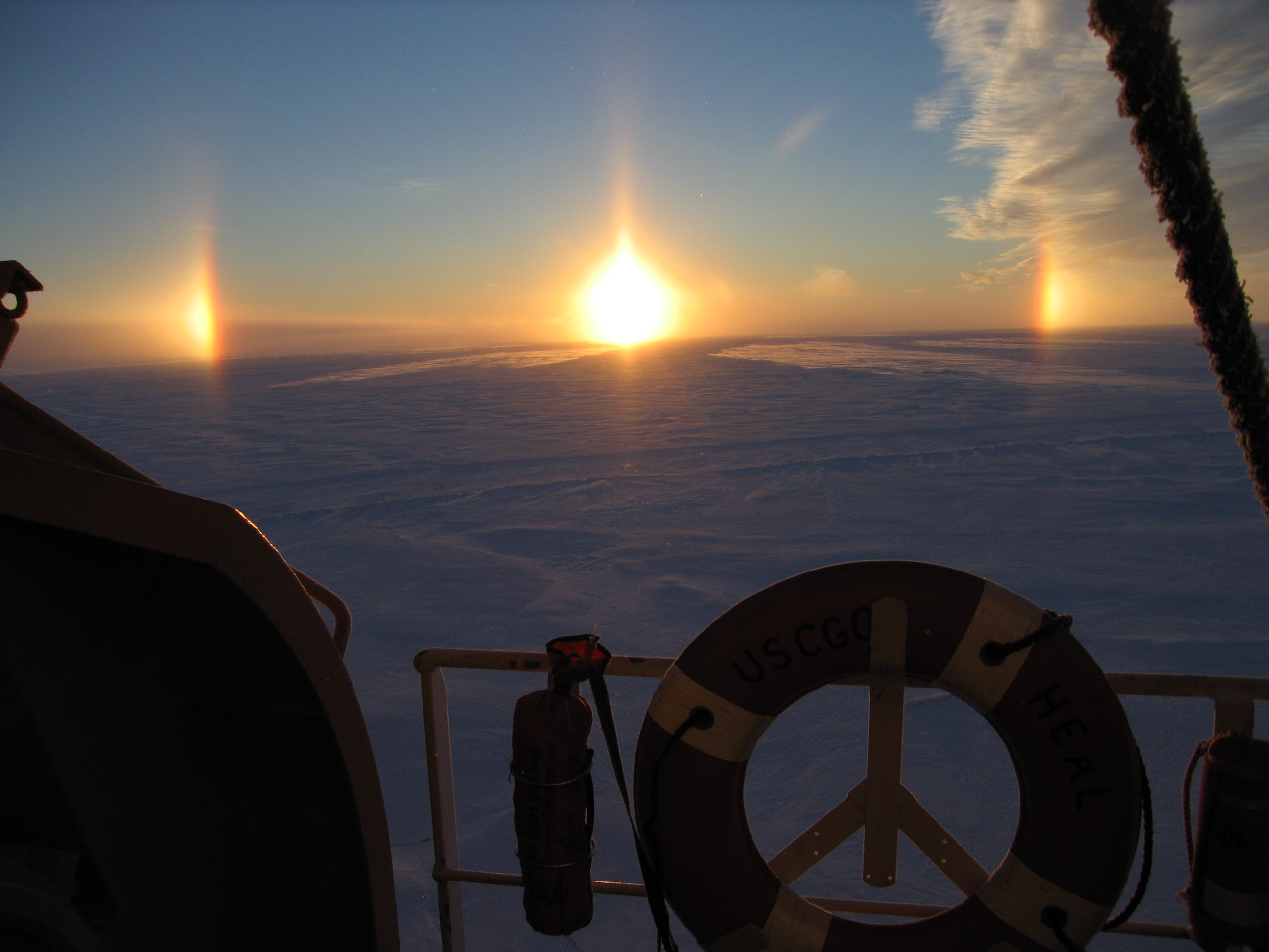 A sundog (parhelion) caused by refraction of sunlight by ice crystals in the atmosphere as seen from the USCGC Healy.