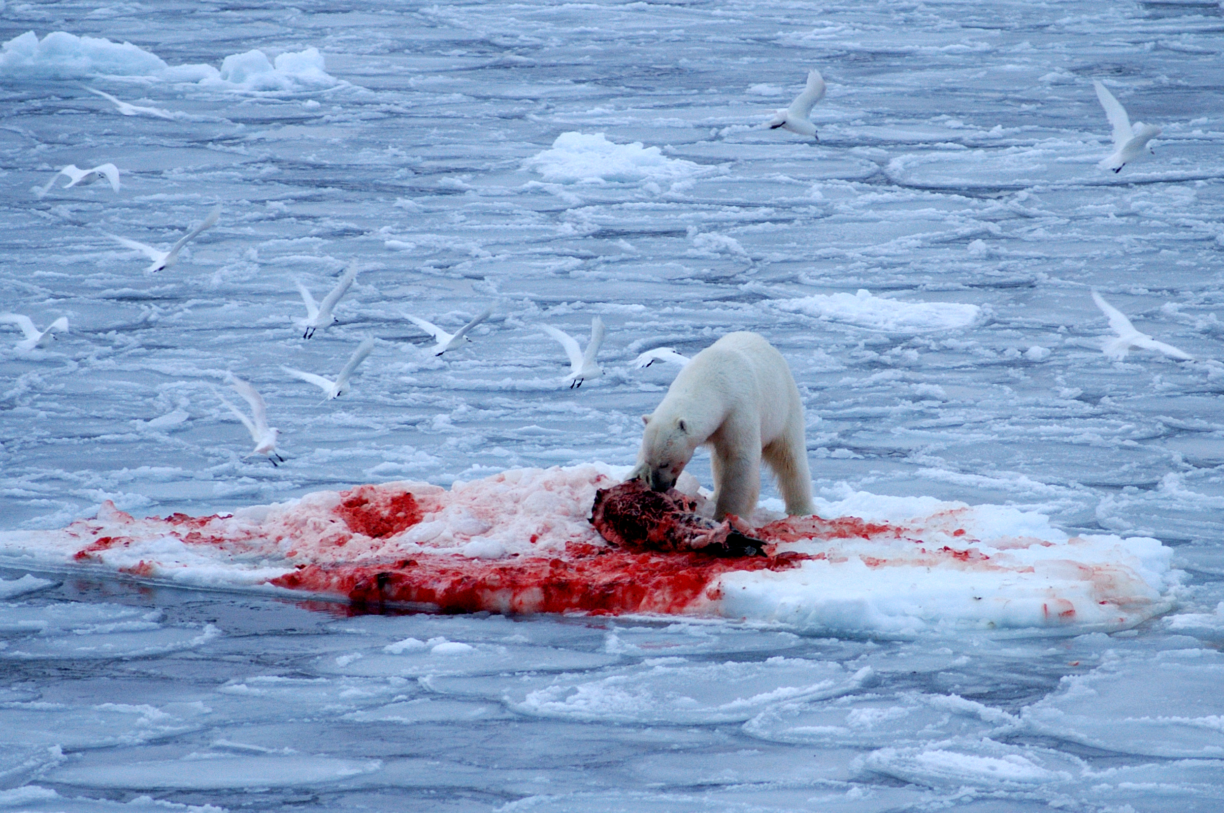 A polar bear makes a meal of a seal on the sea ice of the Arctic Ocean, as seen by the USCGC Healy.