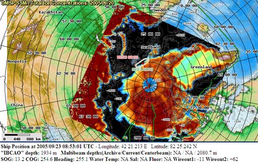 A map of the USCGC Healy's course as of September 23, 2005, overlayed with a map of the ice conditions from that day.