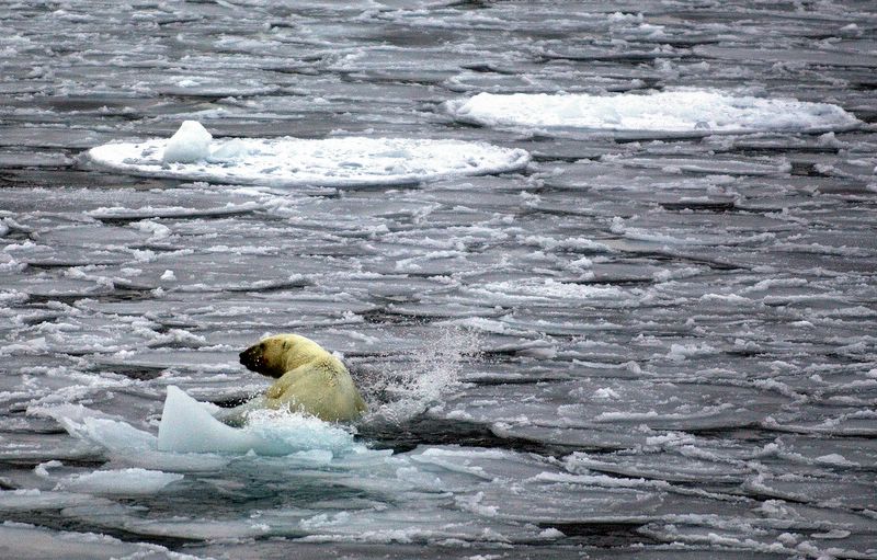 A polar bear swims amongst the pancake ice forming on the Arctic Ocean.
