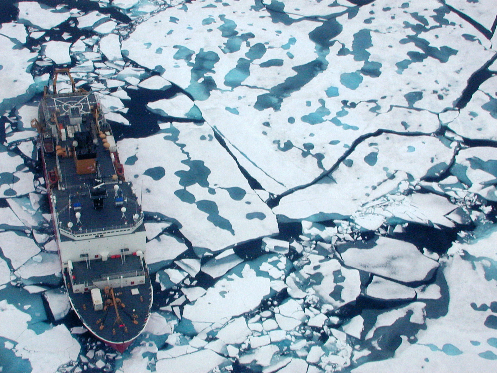 A aerial view of the US Coast Guard icebreaker Healy, surrounded by sea ice and melt ponds.
