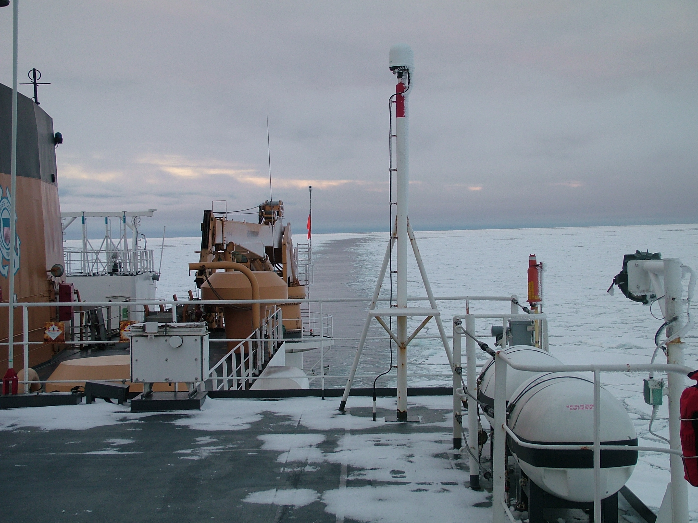A view of the deck of the USCGC Healy and the trail through the ice it has created.