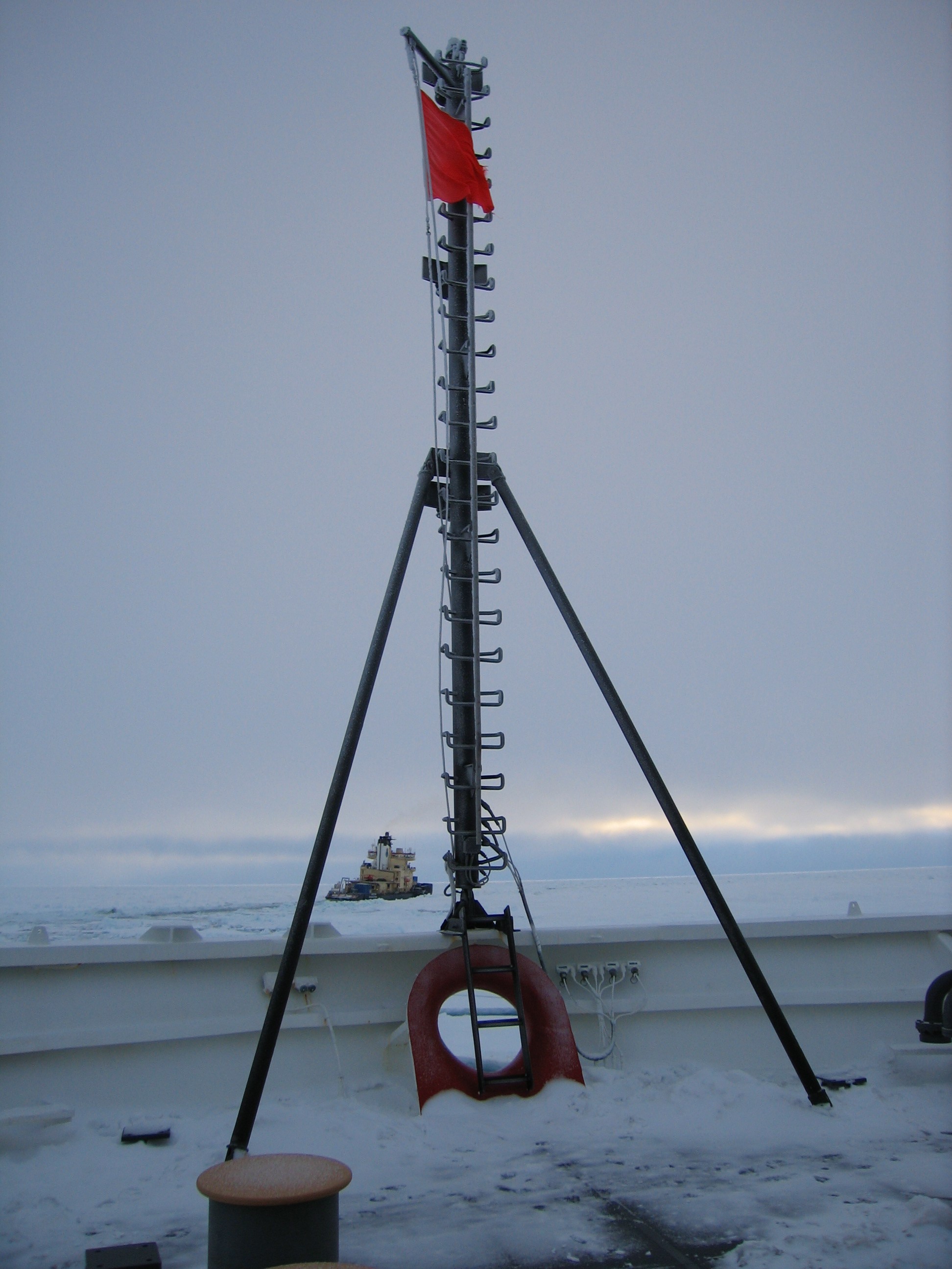 A view of the bow of the USCGC Healy with the Swedish icebreaker Oden in the background.