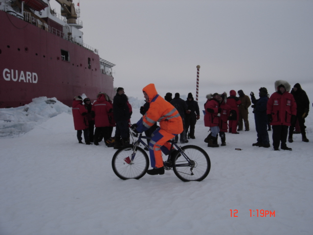 The crew of the USCGC Healy enjoy an ice liberty at the North Pole.