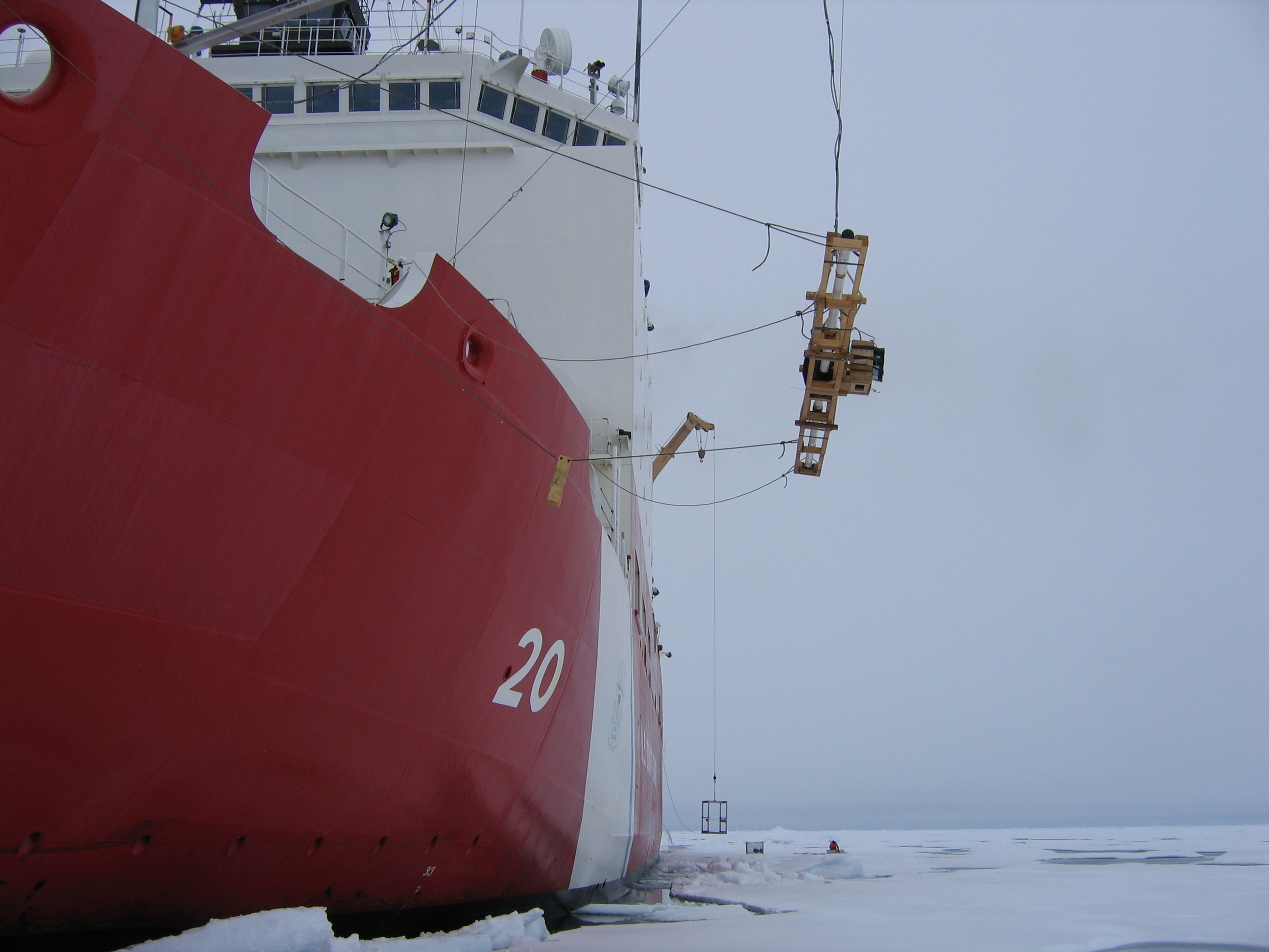 The US Coast Guard (USCG) icebreaker Healy lowers equipment to the ice.