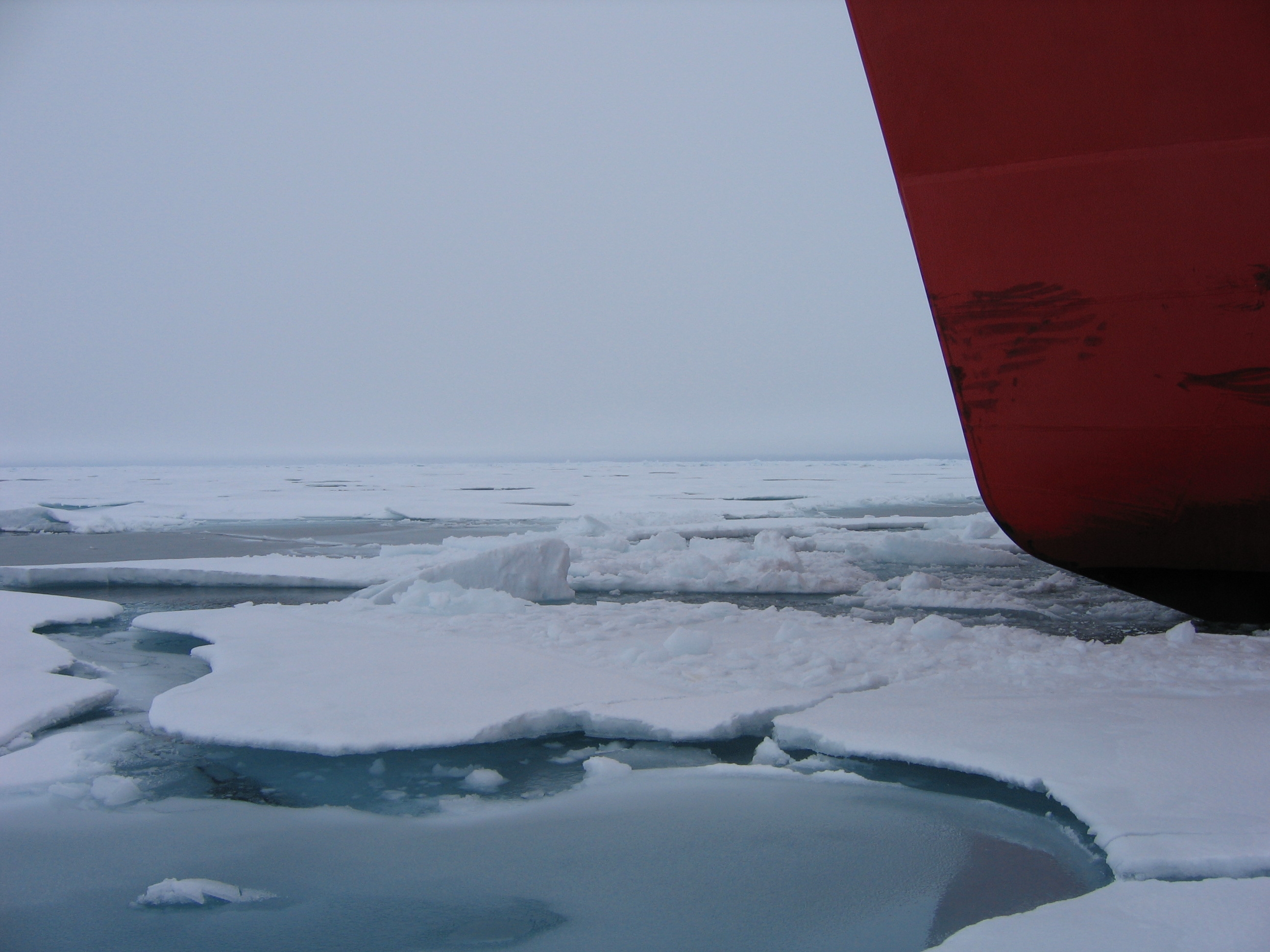 A view of the sea ice around the hull of the USCGC Healy.
