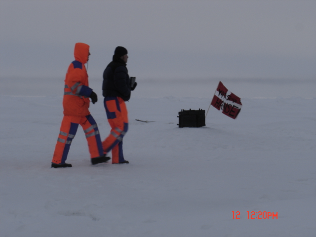 The crew of the USCGC Healy enjoy an ice liberty at the North Pole.
