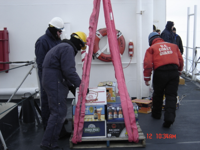 Some of the ice liberty beer being loaded for lowering down onto the sea ice of the Arctic Ocean.