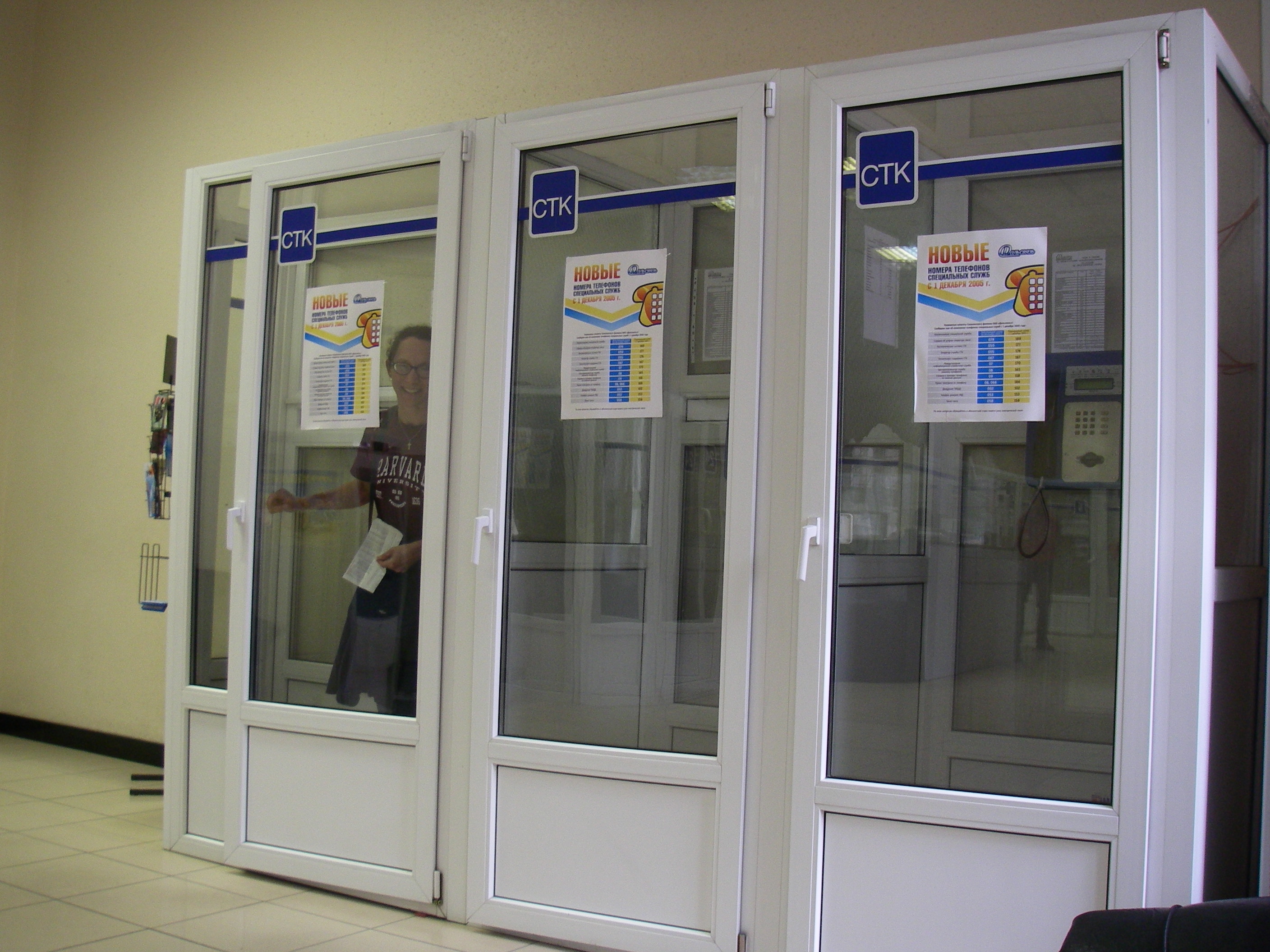 TREC teacher Misty Nikula inside a phone booth for making International phone calls in Yuzhno-Sakhalinsk, Russia.