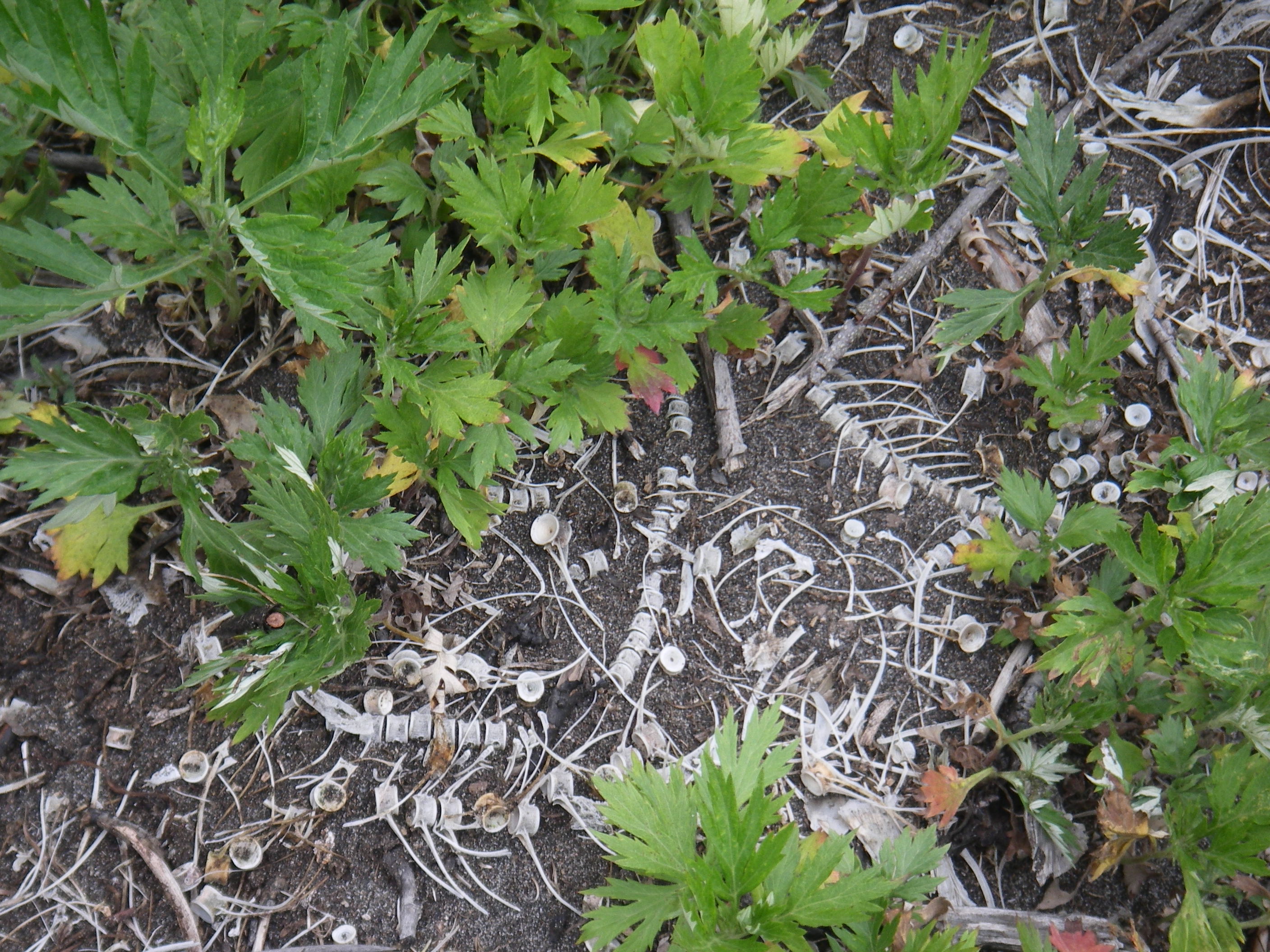Salmon fish bones in an historic midden site found behind a beach dune in Tikhaya, Russia.