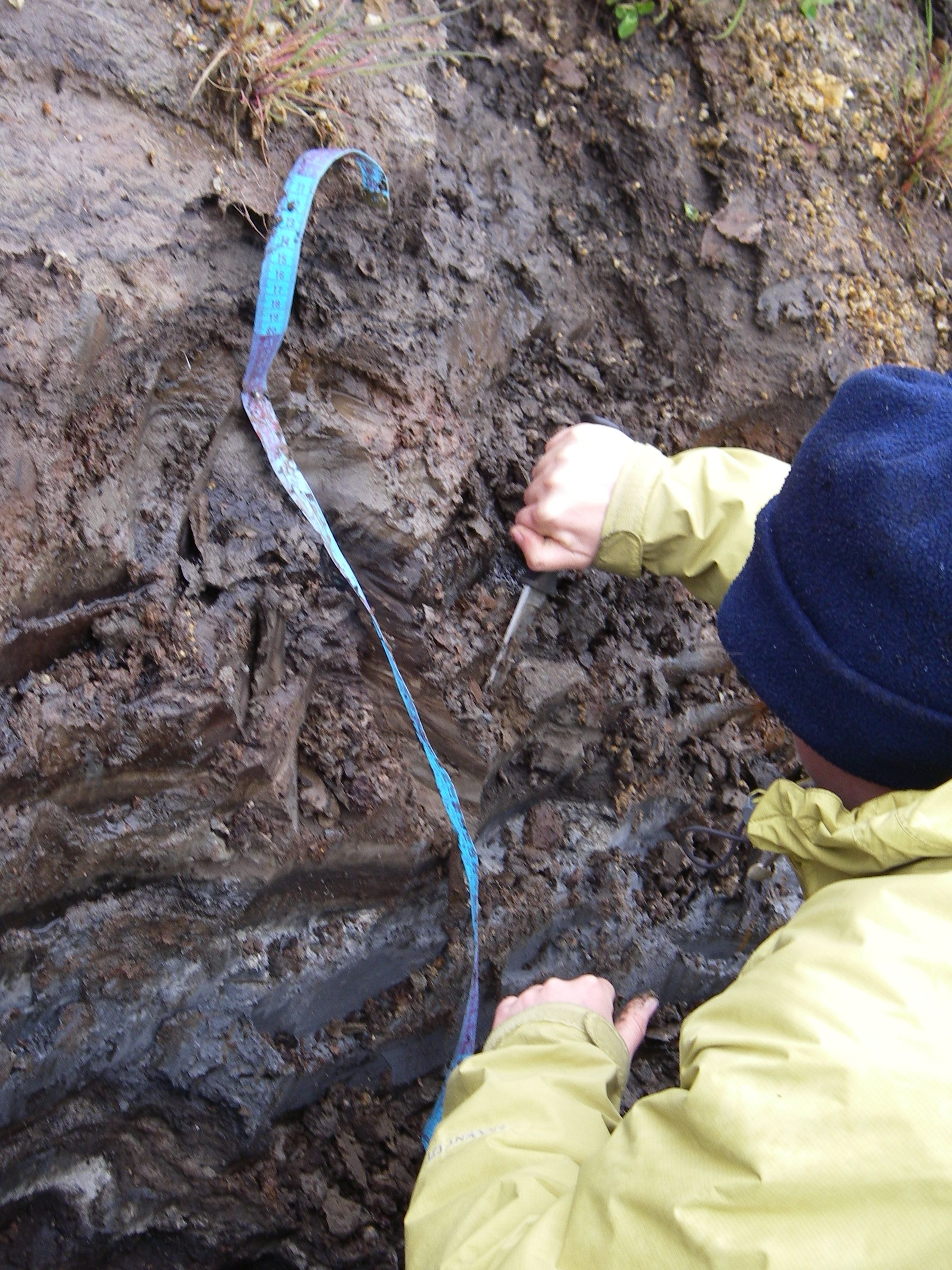 Bre MacInnes works to clean off an excavation along the side of a stream so she can describe the stratigraphic layers.