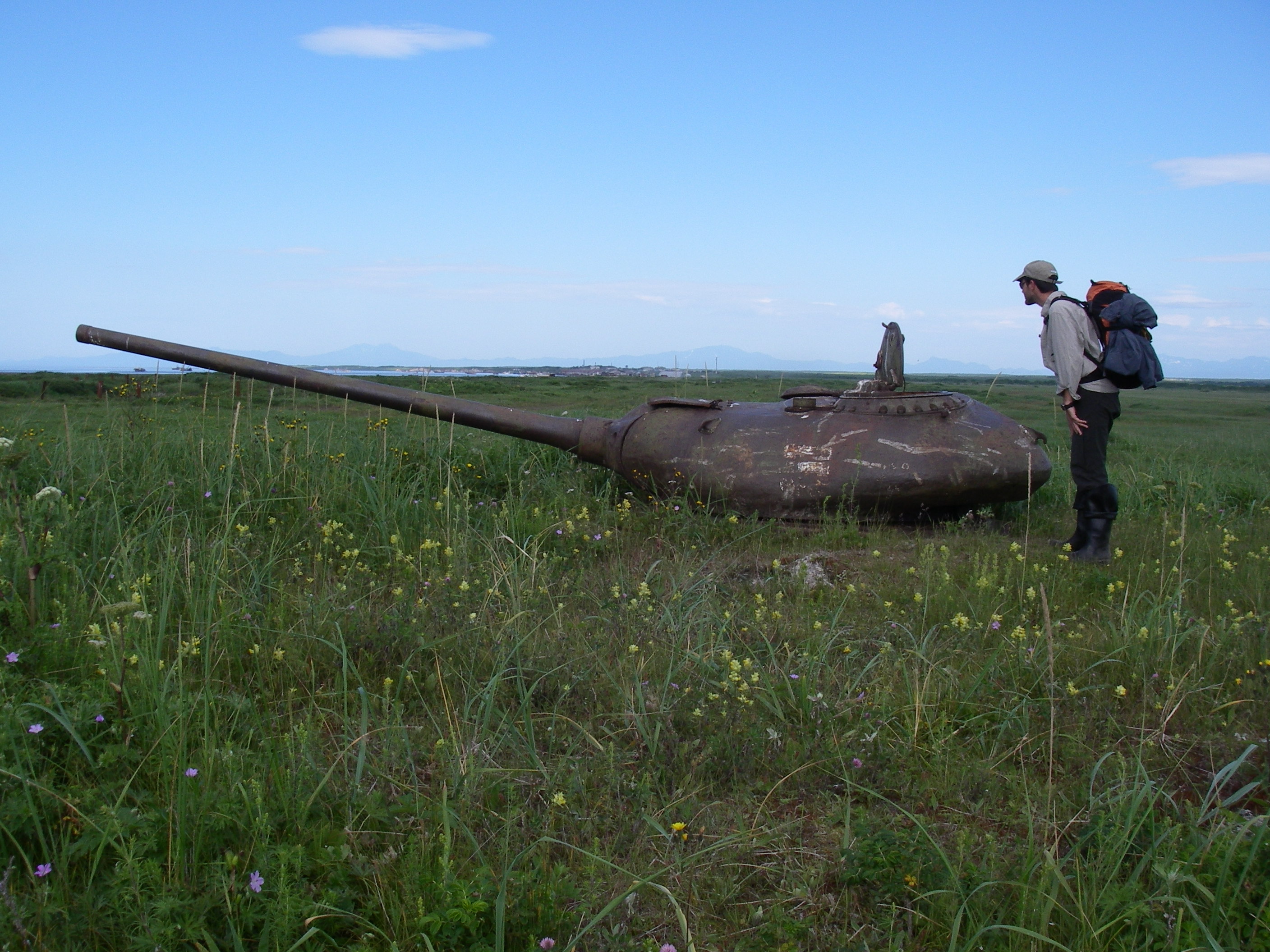 Jesse Einhorn peers into a WWII Japanese gun turret near Golovnina on the southern end of Kunashir Island, Russia.