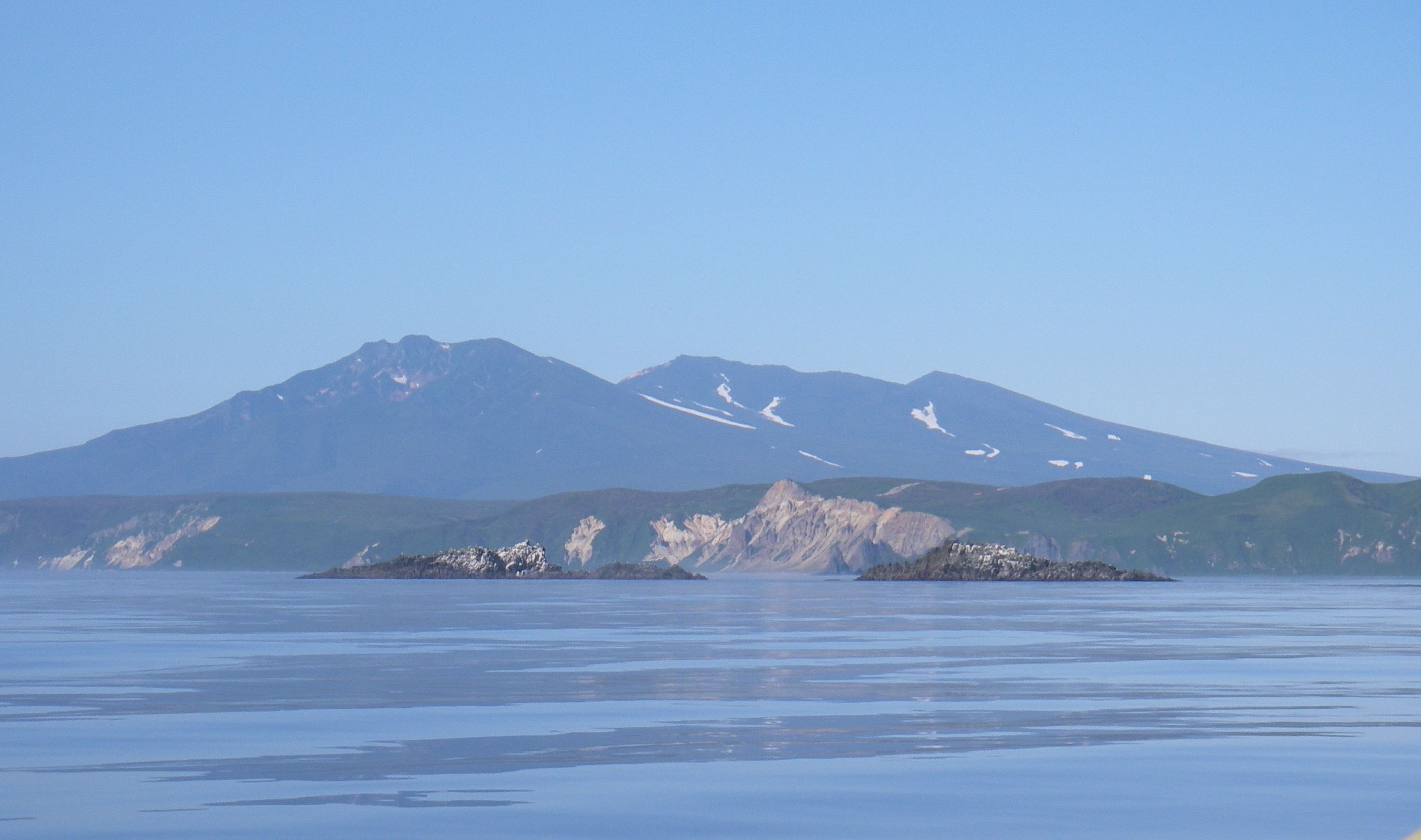 Two volcanic peaks on Urup Island, just north of Ainu Creek, Russia.