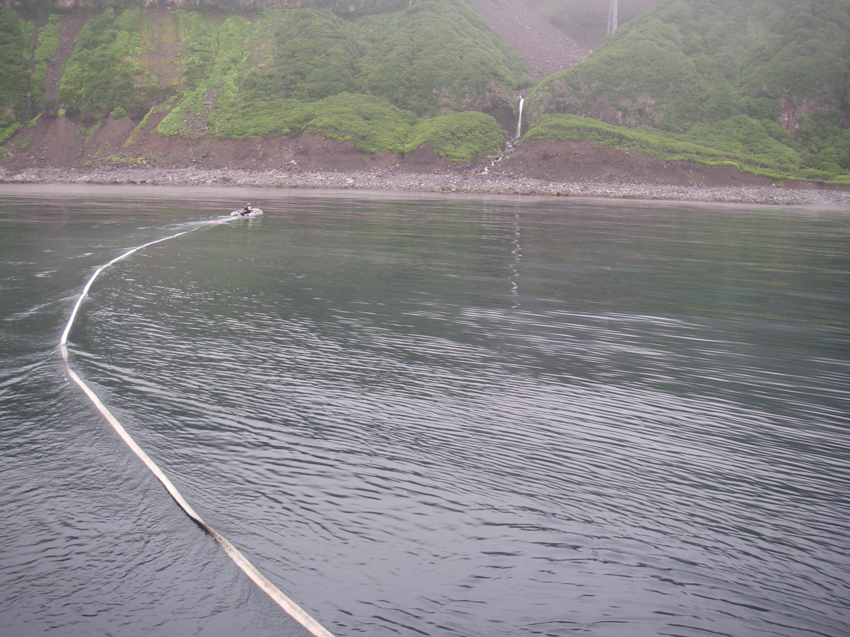 Valery Shubin hauls one end of the firehose to shore in order to load water from the waterfall into the water tanks on the Gipanis.